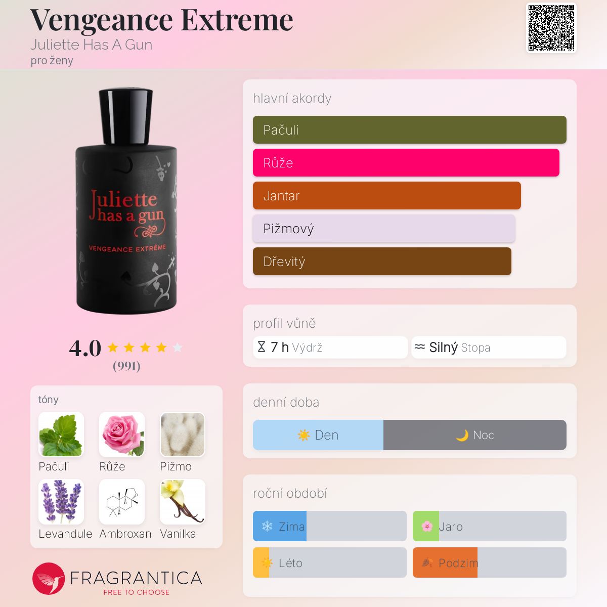 Vengeance Extreme podle Juliette Has A Gun je Chypre Floral vůně pro ženy. Vengeance Extreme byl/a uveden/a v roce 2011. Vrchní tóny jsou Levandule a Bergamot; střední tóny jsouPačuli a Bulharská růže ; základní tóny jsou Bílé pižmo, Ambroxan, Vanilka, Labdanum a Fazole tonka.