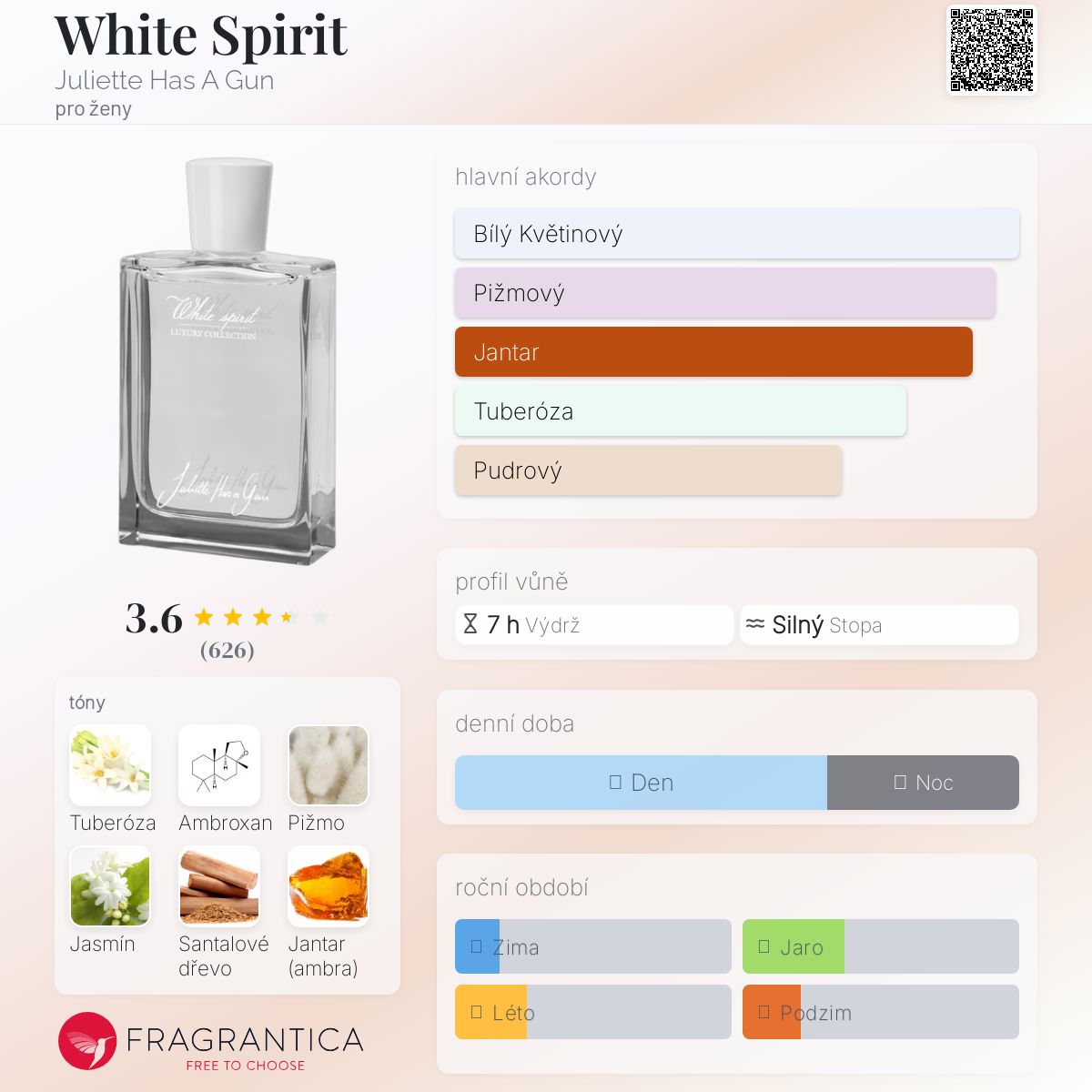 White Spirit podle Juliette Has A Gun je Floral Woody Musk vůně pro ženy. White Spirit byl/a uveden/a v roce 2015. Vrchní tóny jsou Tuberóza a Jasmín Sambac; střední tóny jsouTuberóza a Ambroxan ; základní tóny jsou Pižmo, Santalové dřevo, Jantar (ambra) a Cedr.