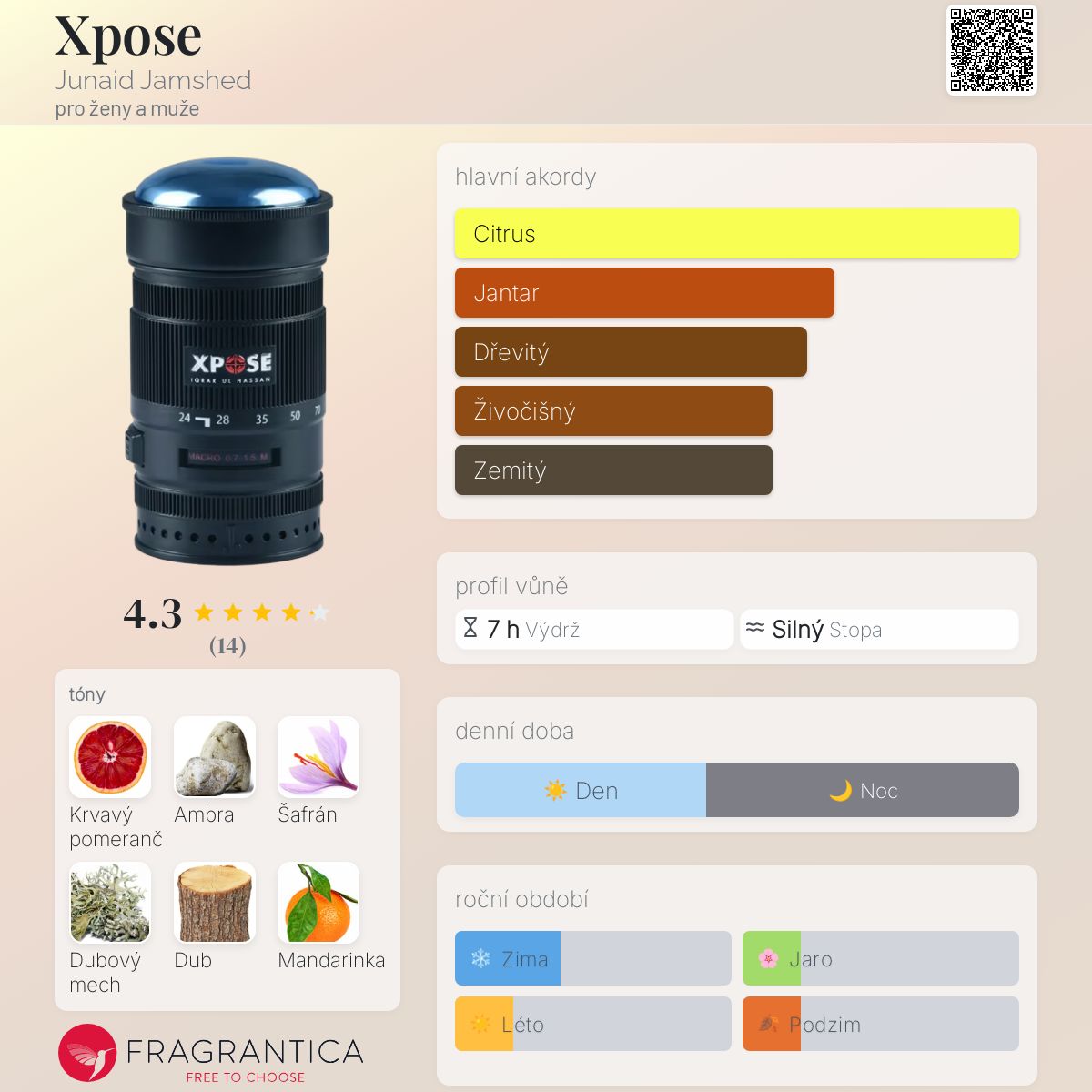 Xpose podle Junaid Jamshed je Woody Aromatic vůně pro ženy a muže. Xpose byl/a uveden/a v roce 2020. Vrchní tóny jsou Mandarinka, Bergamot a Citrón; střední tóny jsouKrvavý pomeranč, Šafrán, Levandule a Šalvěj ; základní tóny jsou Ambra, Dubový mech a Dub.