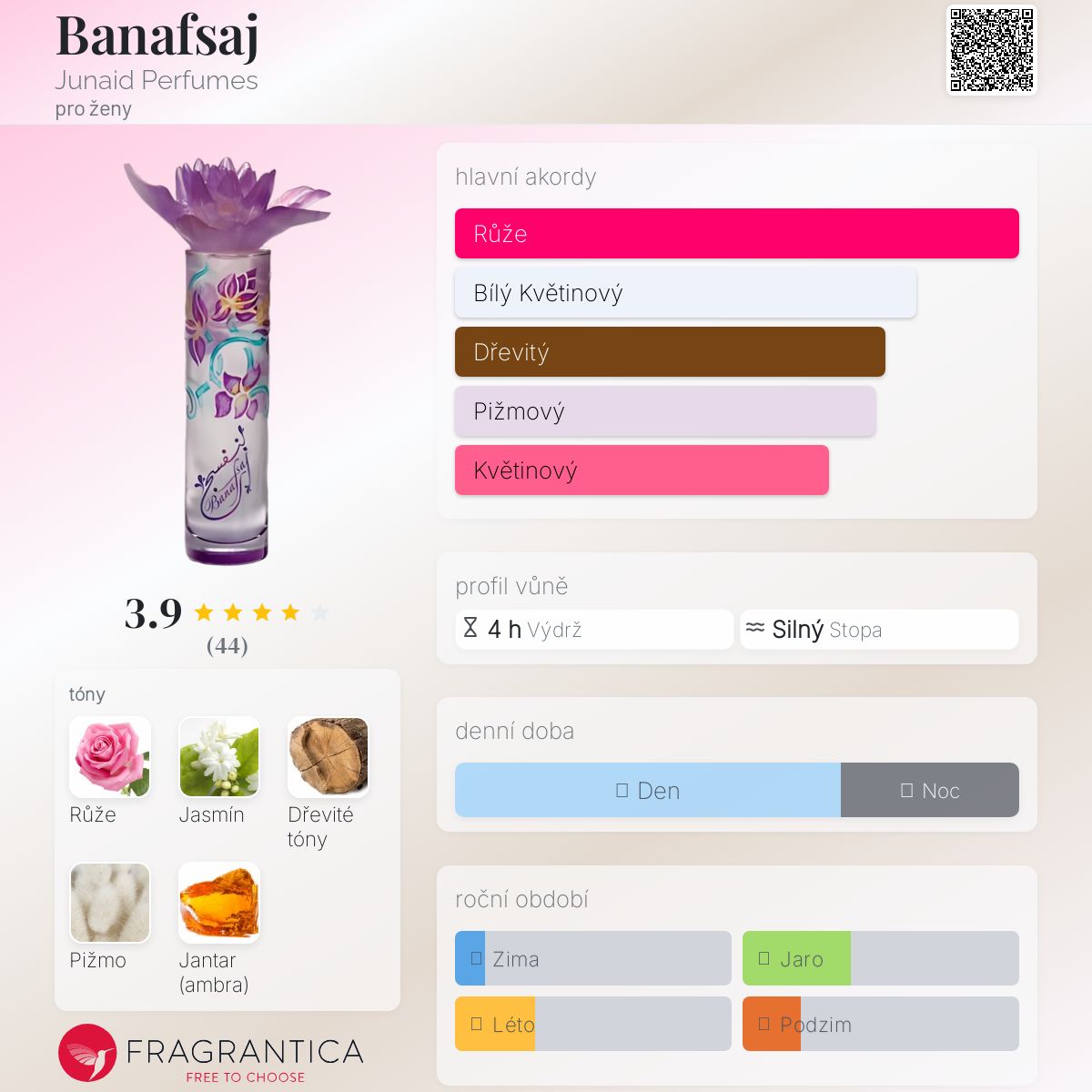 Banafsaj podle Junaid Perfumes je Floral Woody Musk vůně pro ženy. Banafsaj byl/a uveden/a v roce 2008. "Nosem" za touto vůní je Sonia Constant. Vrchní tón je Růže ; střední tóny jsouRůže a Jasmín ; základní tóny jsou Dřevité tóny, Pižmo a Jantar (ambra).