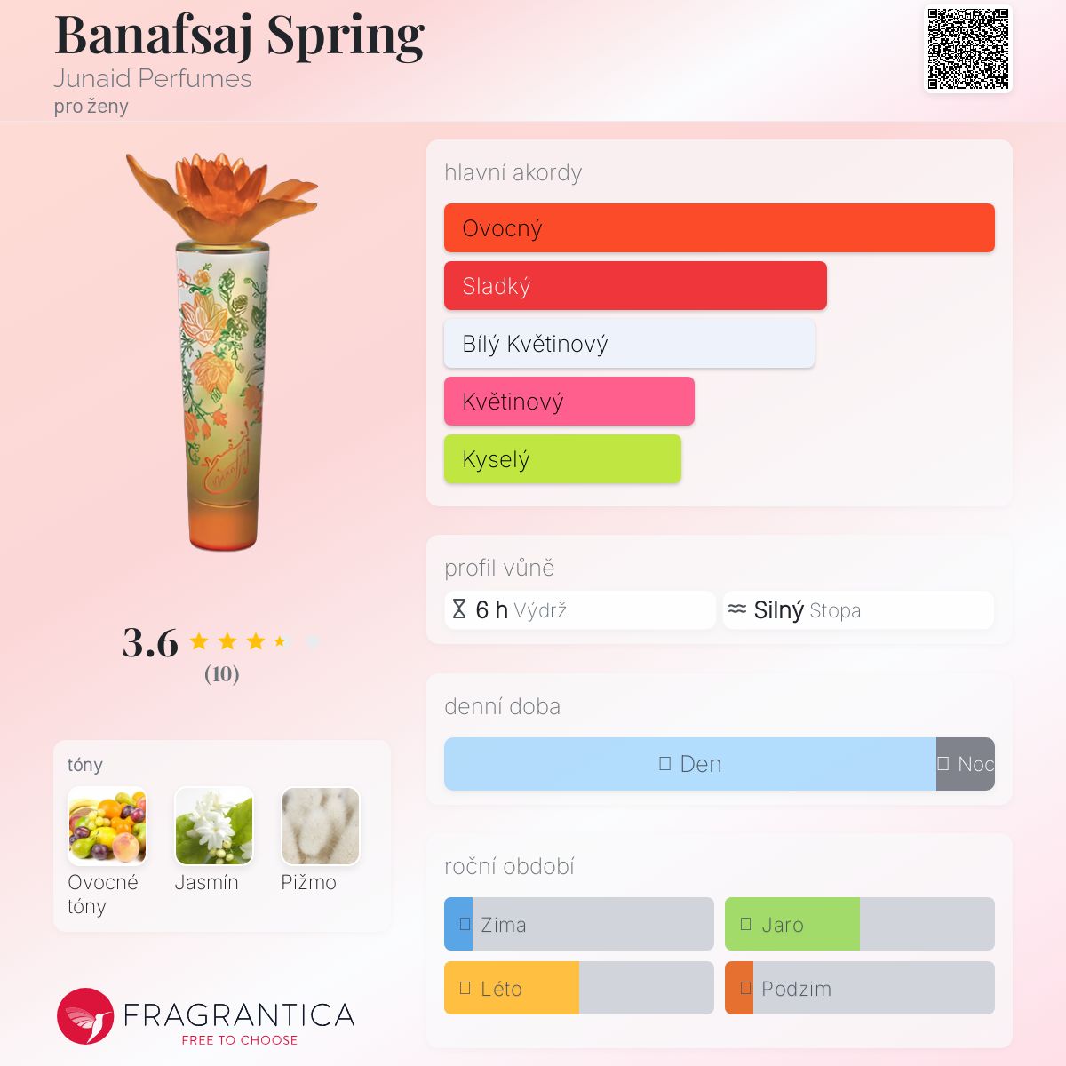 Banafsaj Spring podle Junaid Perfumes je Floral Fruity vůně pro ženy. Banafsaj Spring byl/a uveden/a v roce 2014. Vrchní tón je Ovocné tóny ; střední tón jeJasmín ; základní tón je Pižmo.