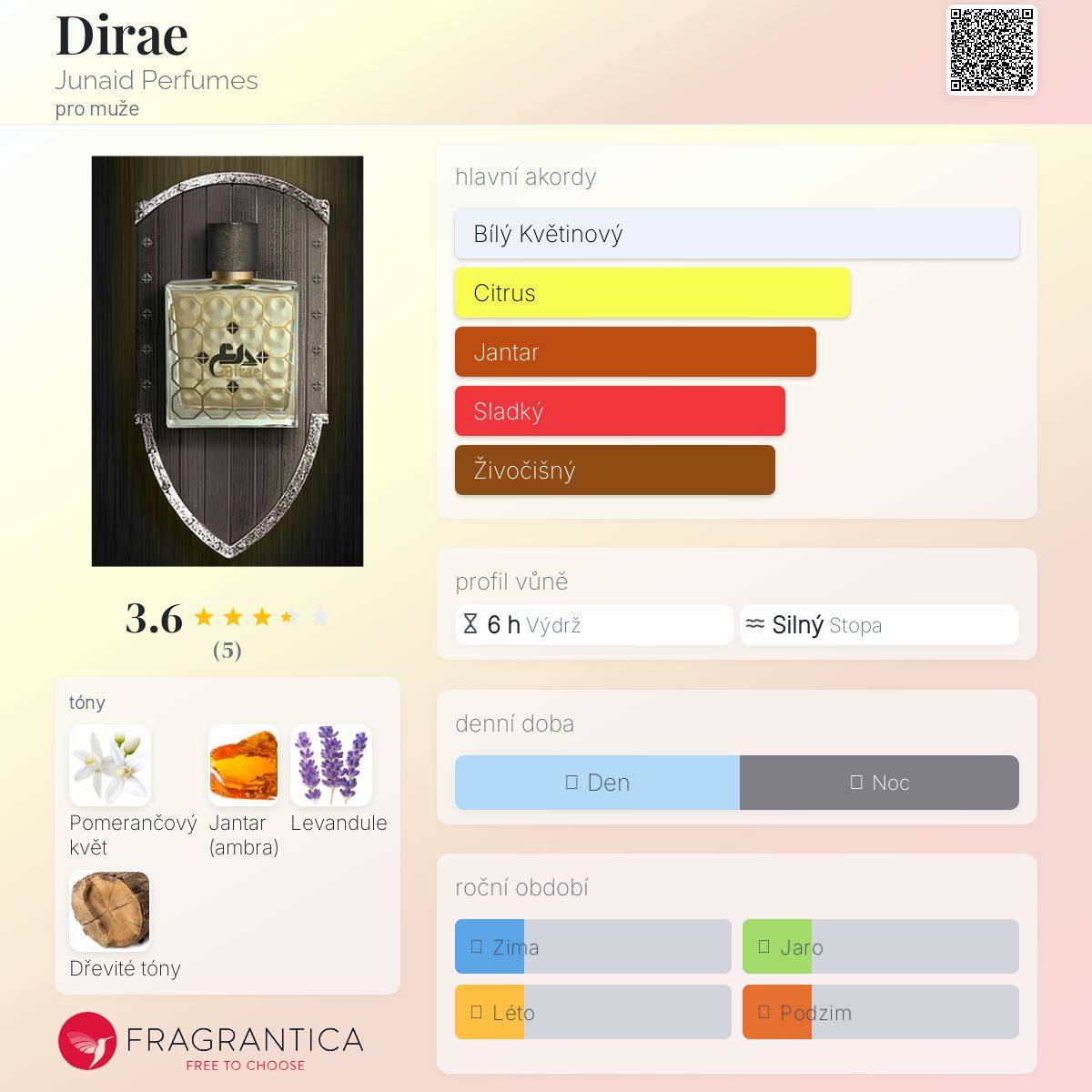 Dirae podle Junaid Perfumes je Woody Aromatic vůně pro muže. Vrchní tón je Pomerančový květ ; střední tóny jsouJantar (ambra) a Levandule ; základní tón je Dřevité tóny.