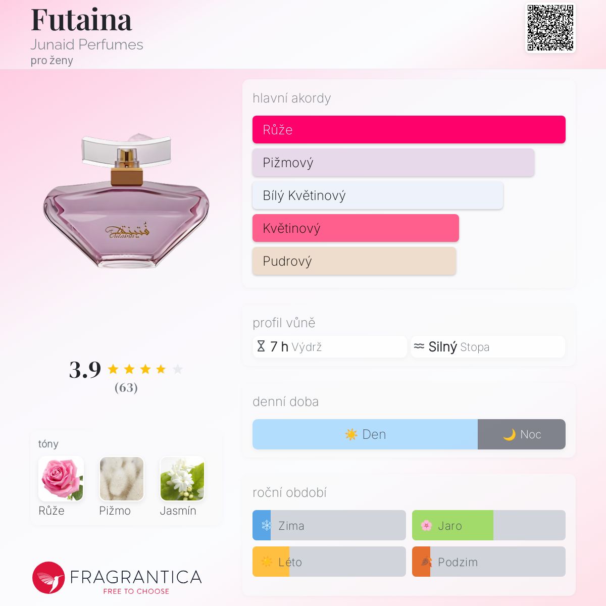 Futaina podle Junaid Perfumes je Floral vůně pro ženy. Vrchní tón je Bílé pižmo ; střední tón jeRůže ; základní tón je Jasmín.