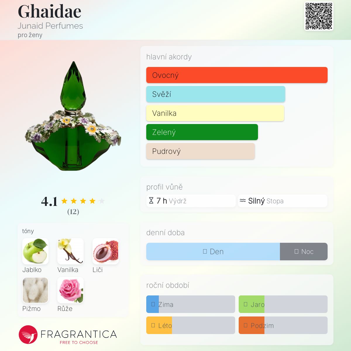 Ghaidae podle Junaid Perfumes je Floral Fruity vůně pro ženy. Ghaidae byl/a uveden/a v roce 2014. Vrchní tóny jsou Zelené jablko a Růže; střední tóny jsouVanilka a Liči ; základní tóny jsou Vanilka a Bílé pižmo.