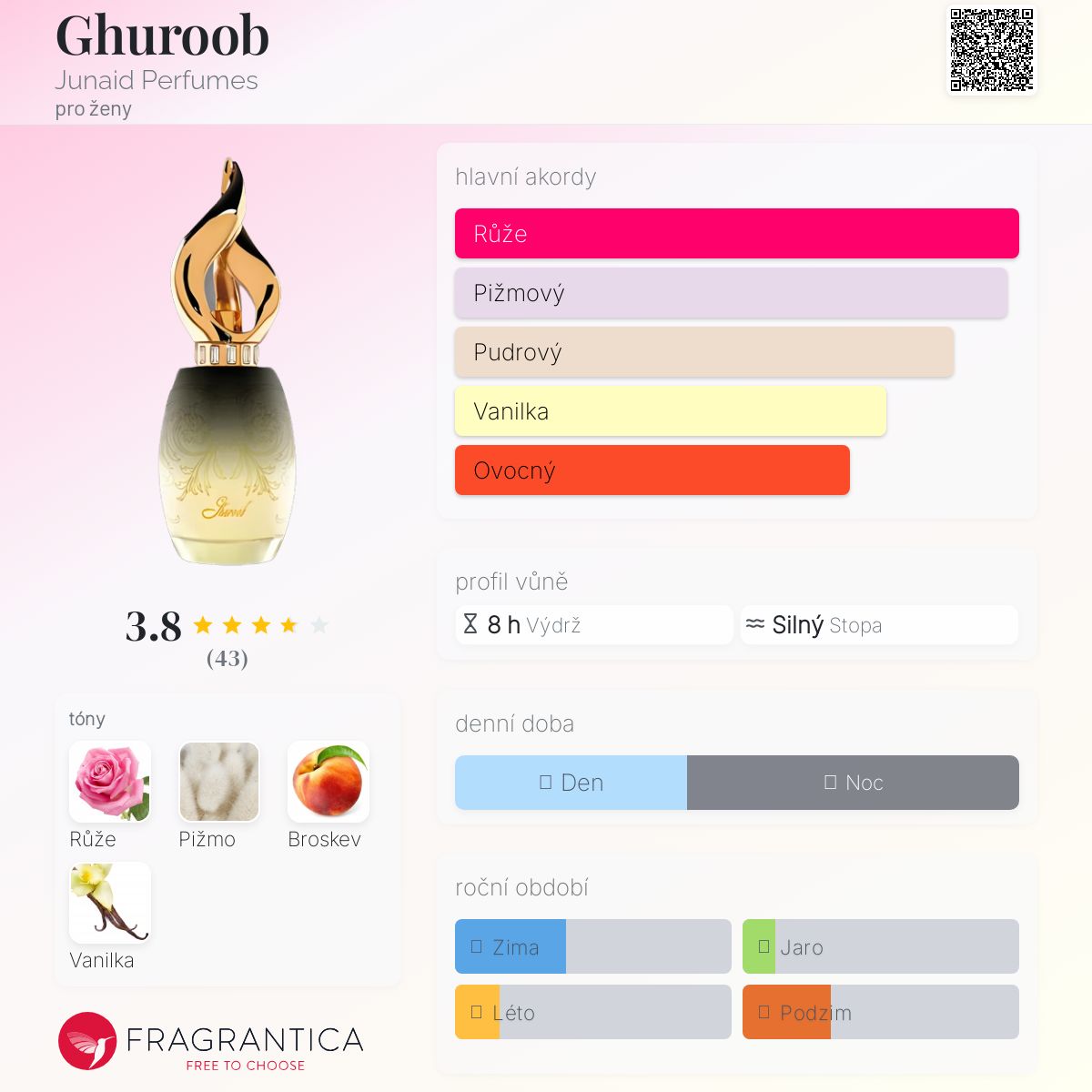 Ghuroob podle Junaid Perfumes je Floral Fruity Gourmand vůně pro ženy. Vrchní tón je Broskev ; střední tón jeRůže ; základní tóny jsou Bílé pižmo a Vanilka.