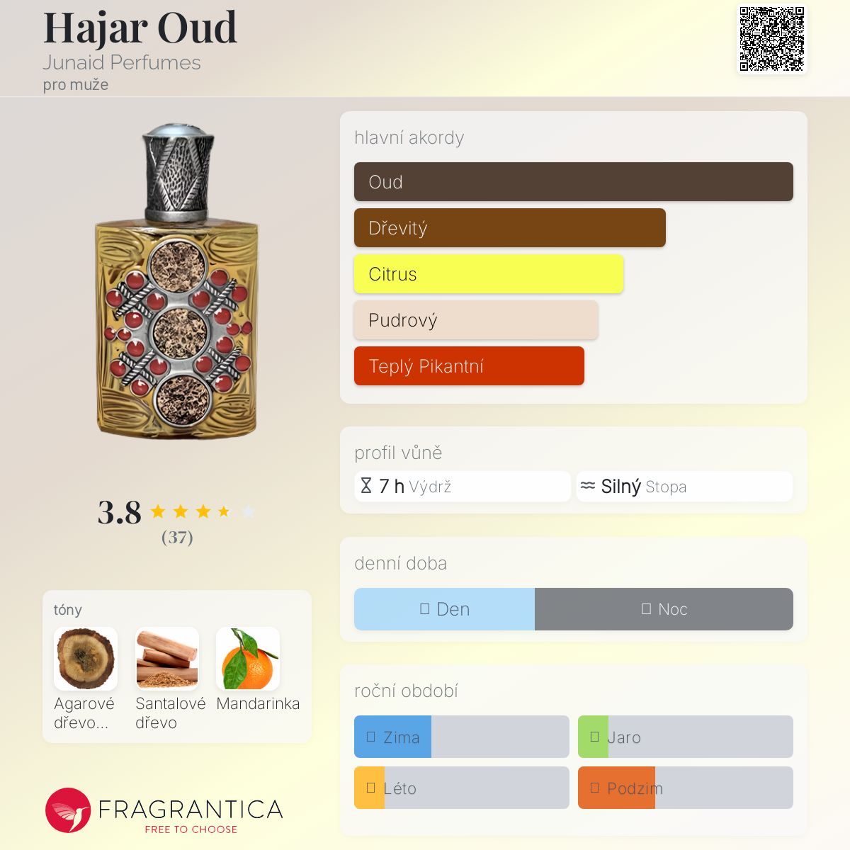 Hajar Oud podle Junaid Perfumes je Orientální Woody vůně pro muže. Vrchní tón je Mandarinka ; střední tón jeSantalové dřevo ; základní tón je Agarové dřevo (oud).