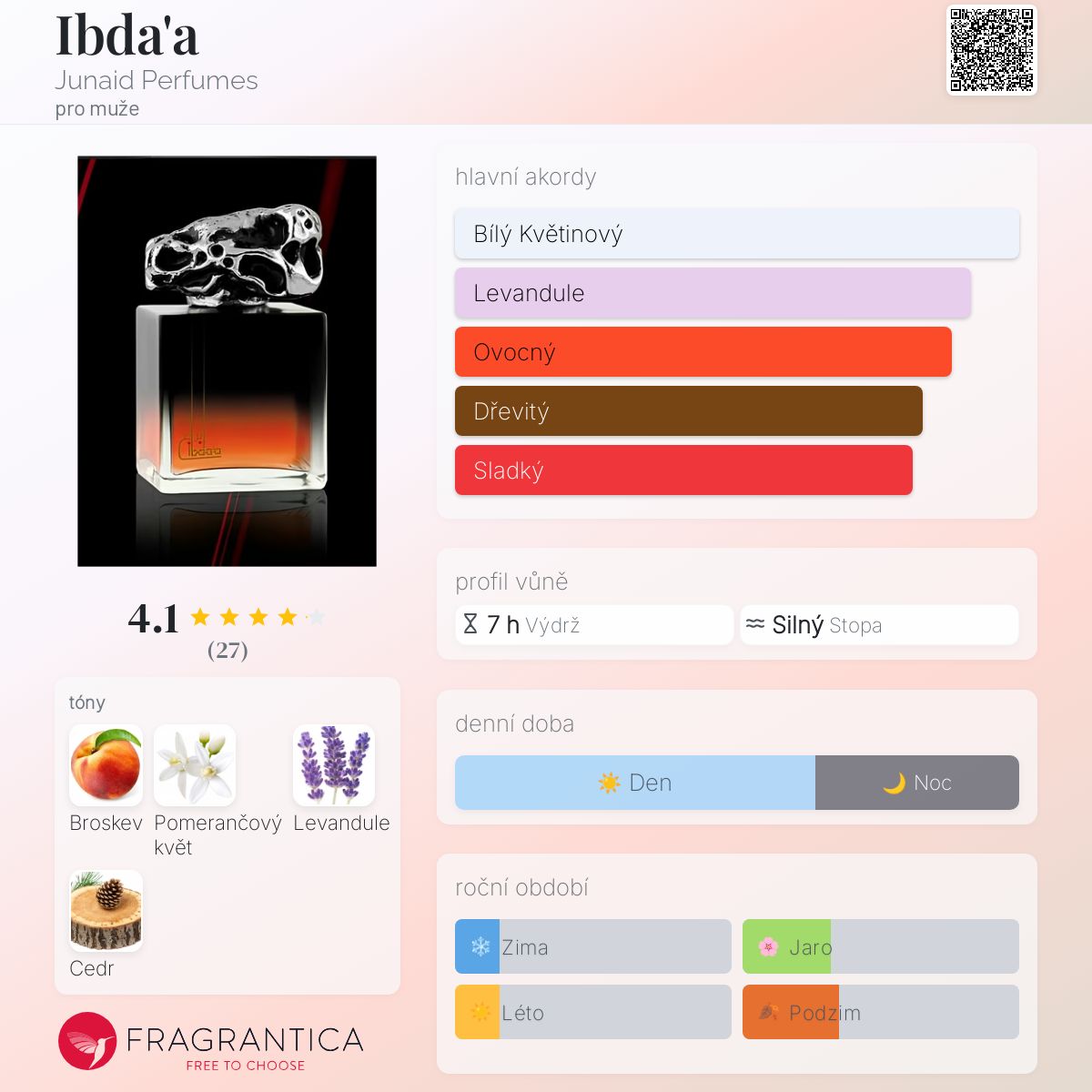Ibda'a podle Junaid Perfumes je Woody Floral Musk vůně pro muže. Vrchní tón je Pomerančový květ ; střední tóny jsouBroskev a Levandule ; základní tón je Cedr.