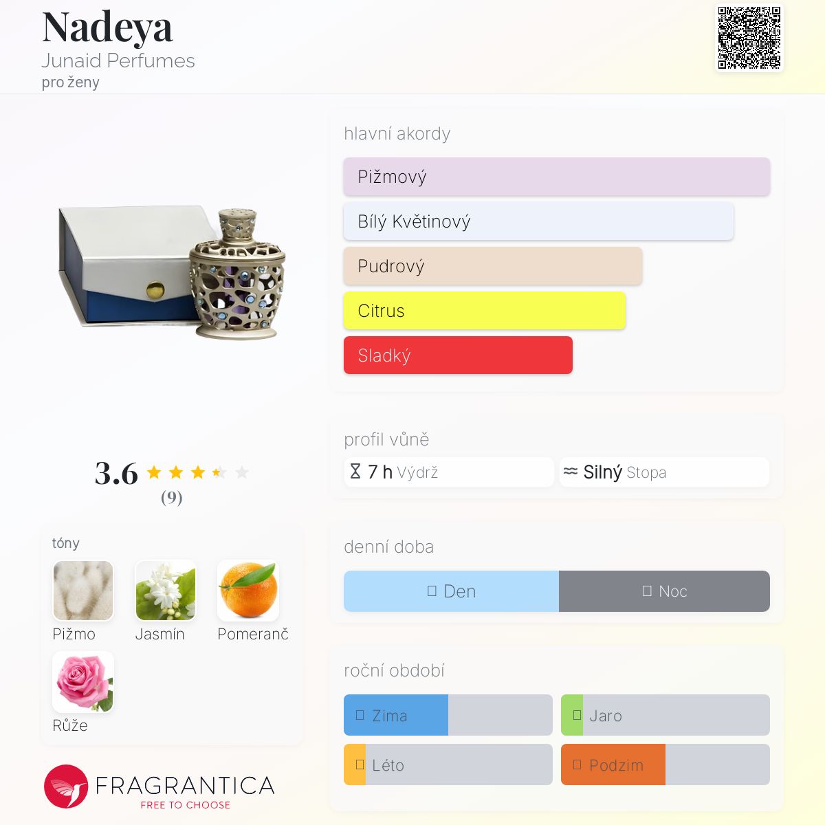 Nadeya podle Junaid Perfumes je Floral vůně pro ženy. Nadeya byl/a uveden/a v roce 2011. Vrchní tón je Pomeranč ; střední tón jeJasmín ; základní tóny jsou Bílé pižmo a Růže.