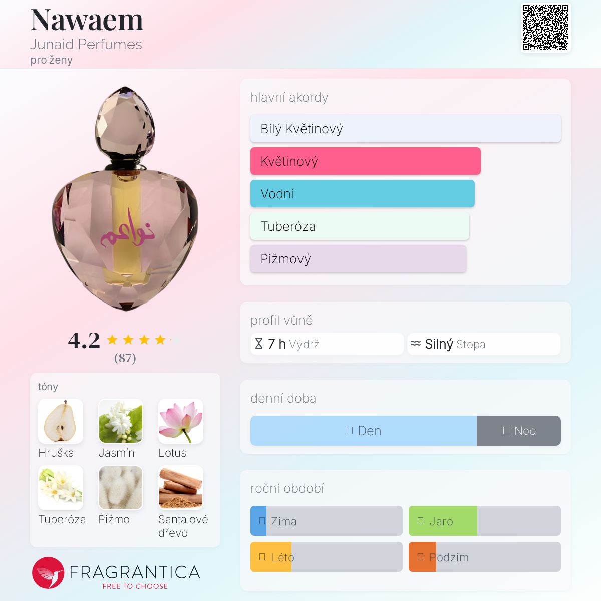 Nawaem podle Junaid Perfumes je Floral Fruity vůně pro ženy. Vrchní tóny jsou Hruška a Lotus; střední tóny jsouJasmín a Tuberóza ; základní tóny jsou Pižmo a Santalové dřevo.