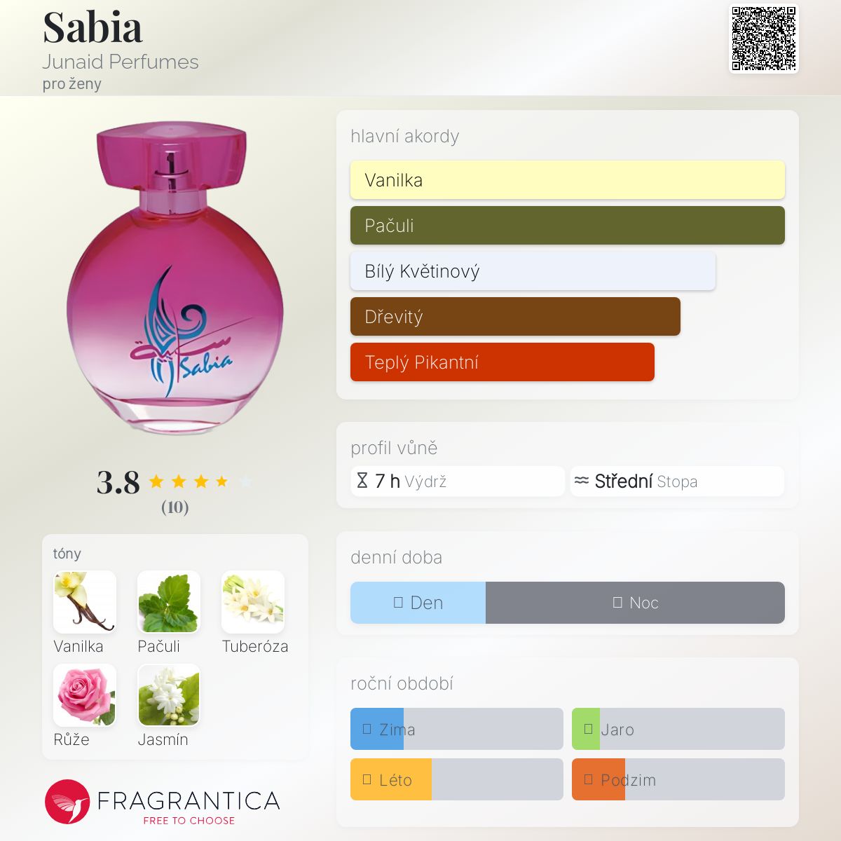 Sabia podle Junaid Perfumes je Floral vůně pro ženy. Vrchní tón je Růže ; střední tóny jsouTuberóza a Jasmín ; základní tóny jsou Vanilka a Pačuli.