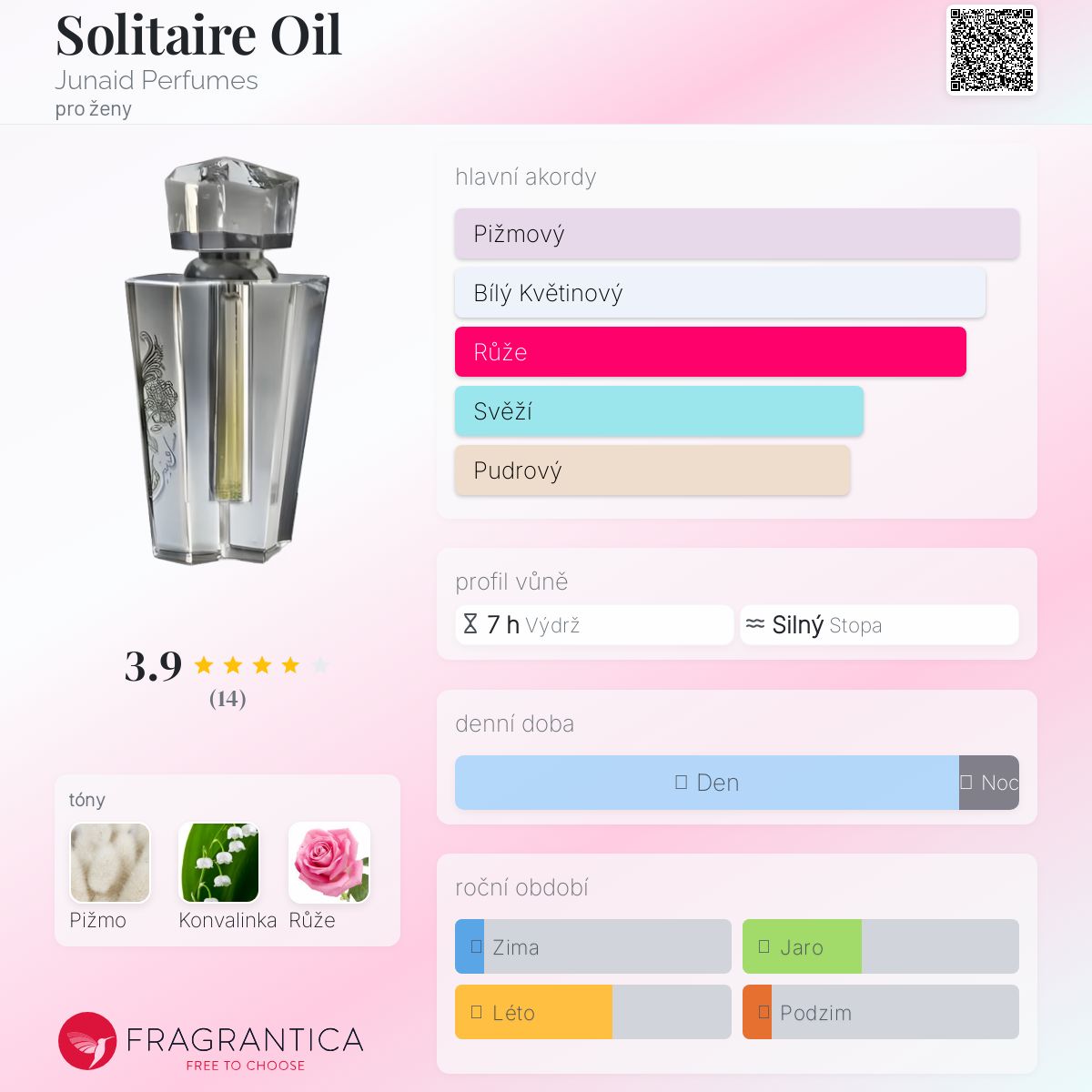 Solitaire Oil podle Junaid Perfumes je Floral vůně pro ženy. Vrchní tóny jsou Konvalinka a Růže; střední tón jeRůže ; základní tón je Bílé pižmo.