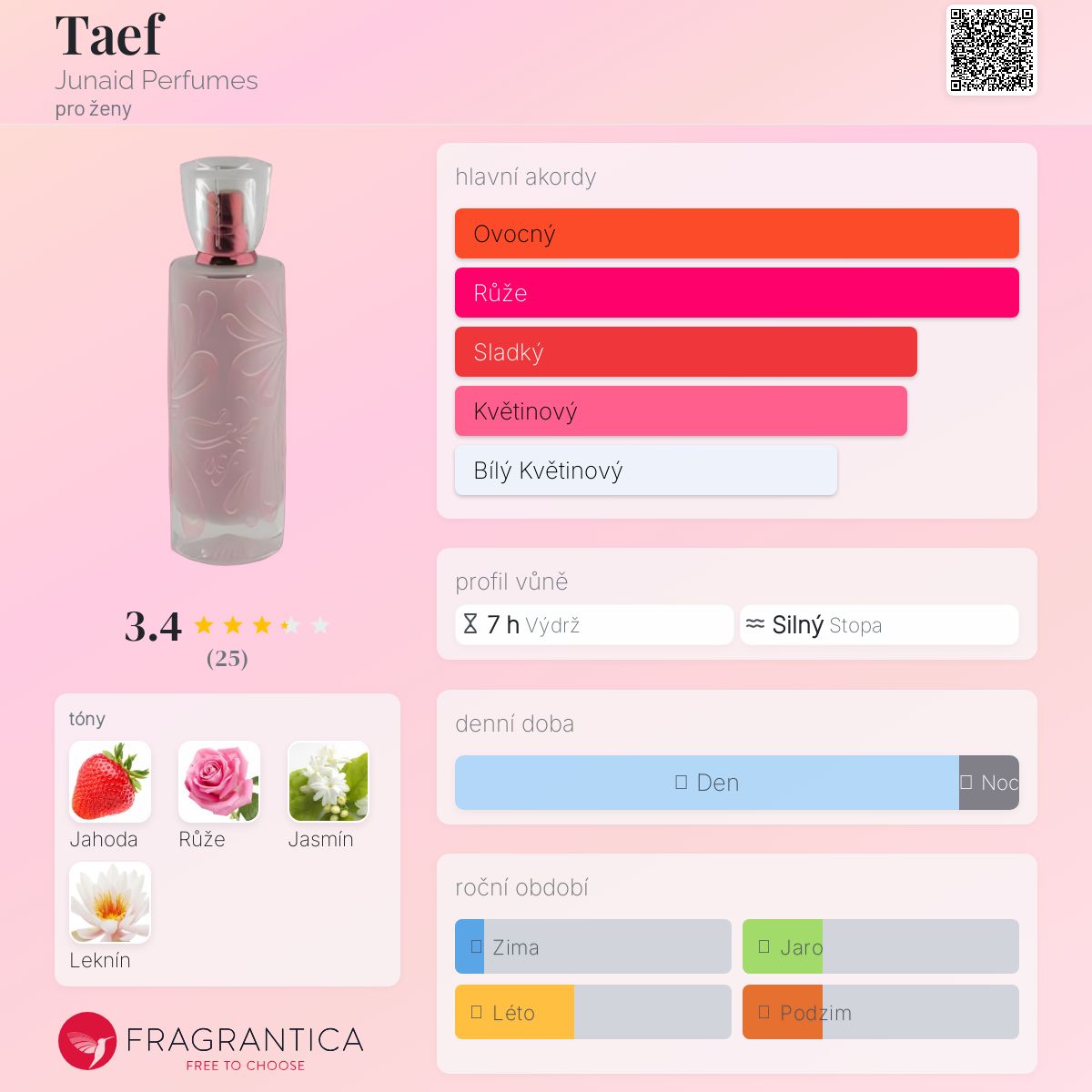 Taef podle Junaid Perfumes je Floral Fruity vůně pro ženy. Vrchní tón je Velká jahoda ; střední tóny jsouJasmín a Leknín ; základní tón je Růže.