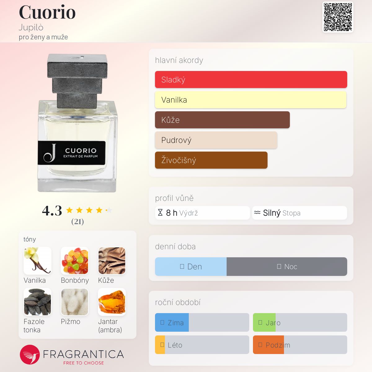 Cuorio podle Jupilò je Orientální Vanilla vůně pro ženy a muže. Toto je nová vůně. Cuorio byl/a uveden/a v roce 2024. "Nosem" za touto vůní je Christian Carbonnel. Vrchní tóny jsou Kůže, Jantar (ambra) a Konvalinka; střední tóny jsouKůže, Fazole tonka a Maliny ; základní tóny jsou Vanilka, Sladké tóny a Pižmo.