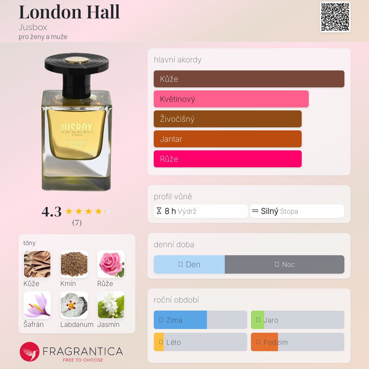 London Hall podle Jusbox je Floral Woody Musk vůně pro ženy a muže. Toto je nová vůně. London Hall byl/a uveden/a v roce 2025. Vrchní tóny jsou Kmín, Šafrán a Citrón; střední tóny jsouRůže, Labdanum, Jasmín, Frézie a Kadidlo ; základní tóny jsou Kůže, Pačuli, Cedr a Vetiver.