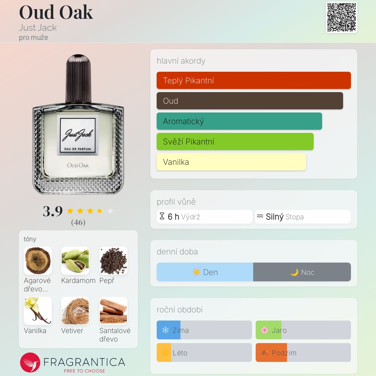 Oud Oak podle Just Jack je Woody Aromatic vůně pro muže. Vrchní tóny jsou Kardamom a Pepř; střední tóny jsouAgarové dřevo (oud), Vanilka a Jantar (ambra) ; základní tóny jsou Vetiver, Santalové dřevo a Fazole tonka.