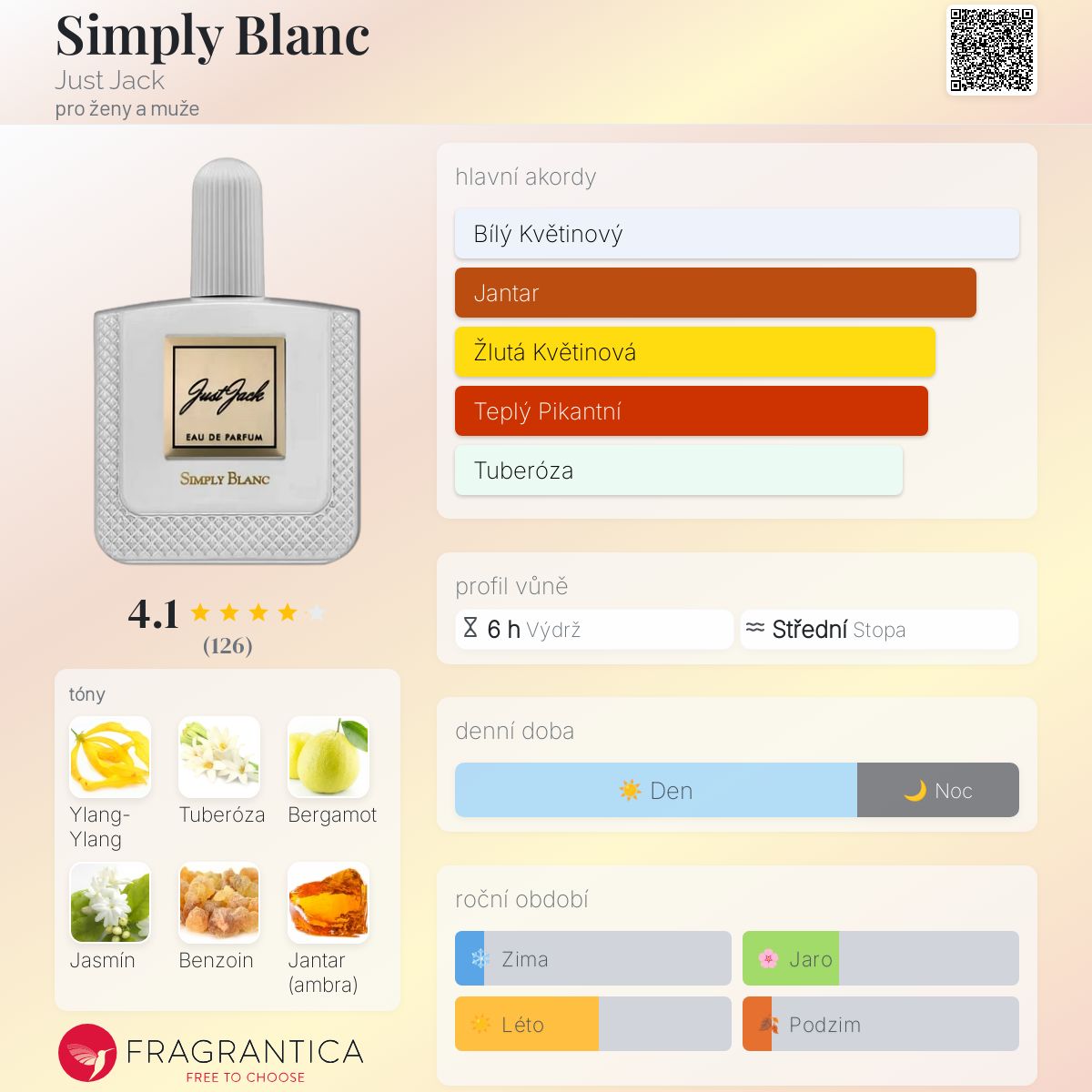 Simply Blanc podle Just Jack je Orientální Floral vůně pro ženy a muže. Vrchní tóny jsou Ylang-Ylang, Bergamot, Kardamom a Pepř; střední tóny jsouTuberóza a Jasmín ; základní tóny jsou Benzoin a Jantar (ambra).