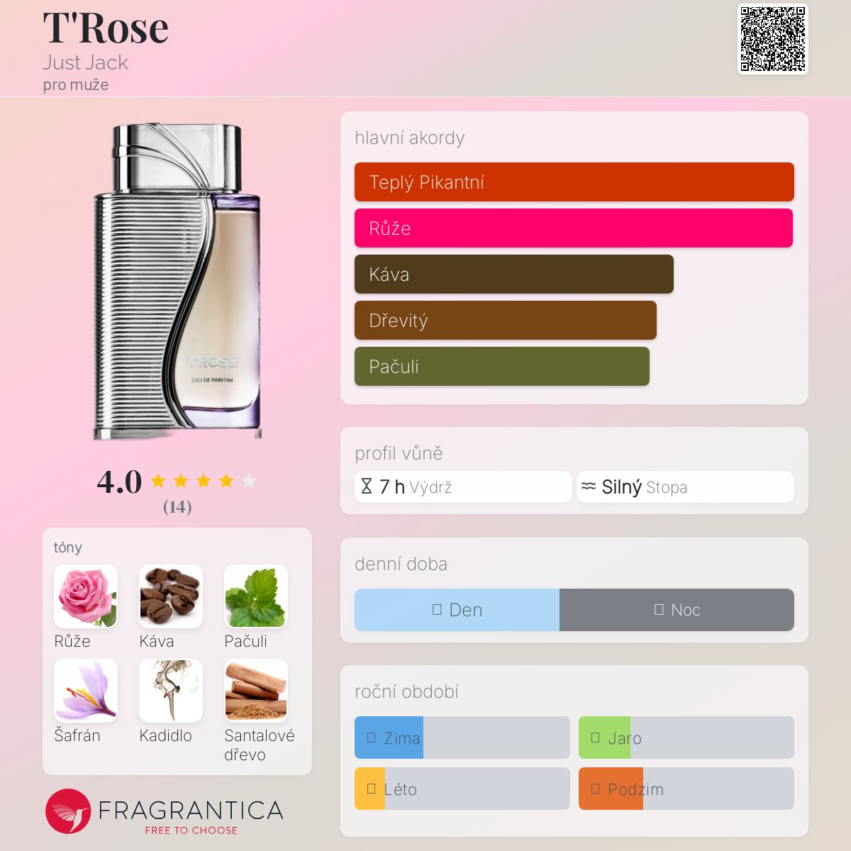 T'Rose podle Just Jack je Woody Spicy vůně pro muže. Vrchní tóny jsou Šafrán a Černý pepř; střední tóny jsouBulharská růže, Turecká růže a Káva ; základní tóny jsou Pačuli, Kadidlo, Santalové dřevo a Jantar (ambra).