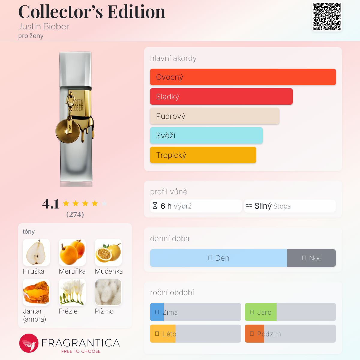 Collector’s Edition podle Justin Bieber je Floral Fruity vůně pro ženy. Collector’s Edition byl/a uveden/a v roce 2014. Vrchní tóny jsou Hruška, Mučenka a Bergamot; střední tóny jsouFrézie, Otočník a Zimolez ; základní tóny jsou Meruňka, Jantar (ambra), Bílé pižmo a Santalové dřevo.