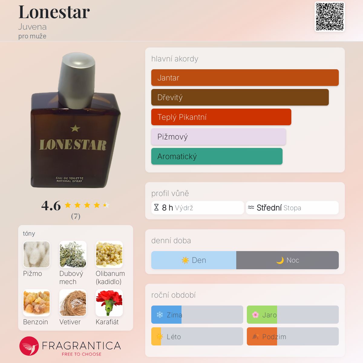 Lonestar podle Juvena je Orientální Fougere vůně pro muže. Lonestar byl/a uveden/a v roce 1992. Vrchní tóny jsou Zelené tóny, Bazalka, Cypřiš, Bergamot a Citron amalfi; střední tóny jsouVetiver, Karafiát, Jasmín, Pačuli, Virginský cedr a Pelargónie ; základní tóny jsou Pižmo, Dubový mech, Olibanum, Benzoin, Kastoreum, Francouzské labdanum, Jantar (ambra), Kůže a Fazole tonka.
