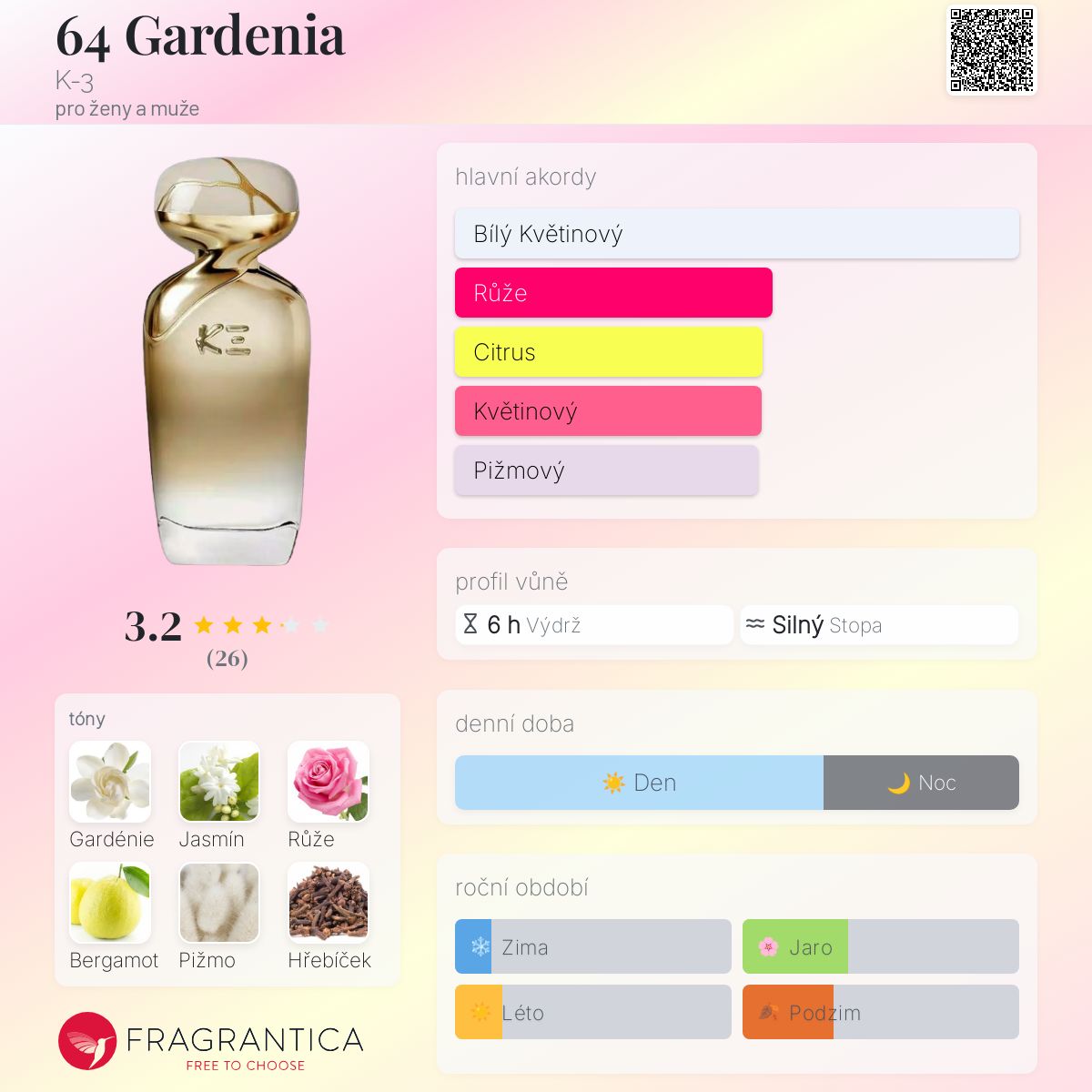 64 Gardenia podle K-3 je Floral vůně pro ženy a muže. Toto je nová vůně. 64 Gardenia byl/a uveden/a v roce 2024. "Nosem" za touto vůní je Clement Gavarry. Vrchní tóny jsou Bergamot, Hřebíček a Černý rybíz; střední tóny jsouGardénie, Jasmín a Růže ; základní tóny jsou Bílé pižmo, Světlá dřeva a Pačuli.