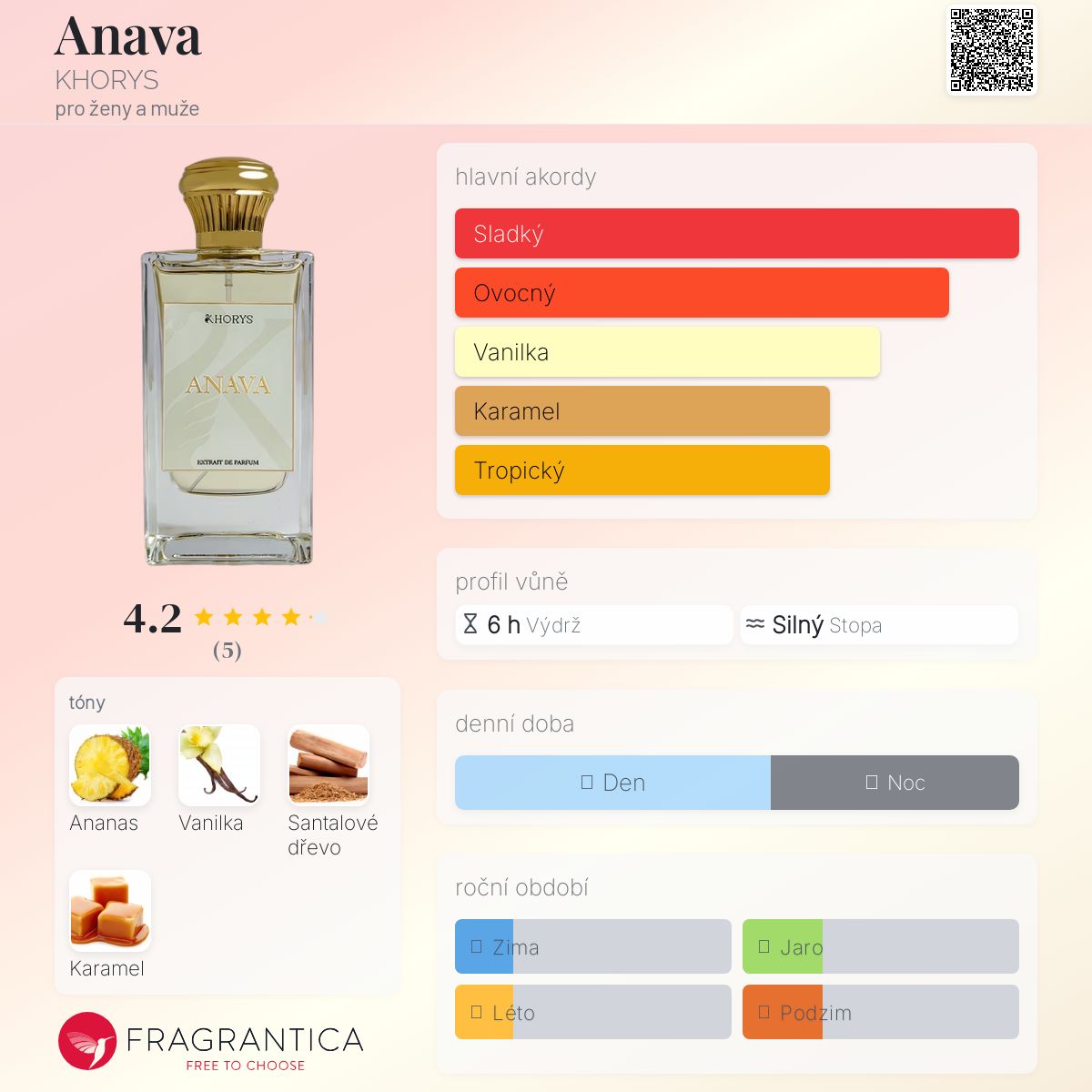 Anava podle KHORYS je Orientální Vanilla vůně pro ženy a muže. Toto je nová vůně. Anava byl/a uveden/a v roce 2025. "Nosem" za touto vůní je Alp Veliogullari. Vrchní tóny jsou Ananas a Vanilka; střední tón jeVanilka ; základní tóny jsou Santalové dřevo a Karamel.