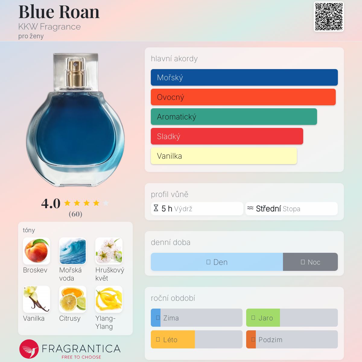 Blue Roan podle KKW Fragrance je Floral Woody Musk vůně pro ženy. Blue Roan byl/a uveden/a v roce 2021. Vrchní tóny jsou Bílá broskev, Mořské tóny a Citrusy; střední tóny jsouHruškový květ, Ylang-Ylang a Pelargónie ; základní tóny jsou Vanilka, Pižmo a Jantarové dřevo.