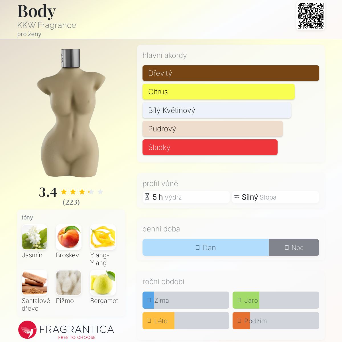 Body podle KKW Fragrance je Floral Woody Musk vůně pro ženy. Body byl/a uveden/a v roce 2018. "Nosem" za touto vůní je Nicole Mancini. Vrchní tóny jsou Broskev, Bergamot, Zelená mandarinka a Růžový pepř; střední tóny jsouJasmín Sambac, Ylang-Ylang a Turecká růže ; základní tóny jsou Australské santalové dřevo, Pižmo, Haitský vetiver a Jantar (ambra).