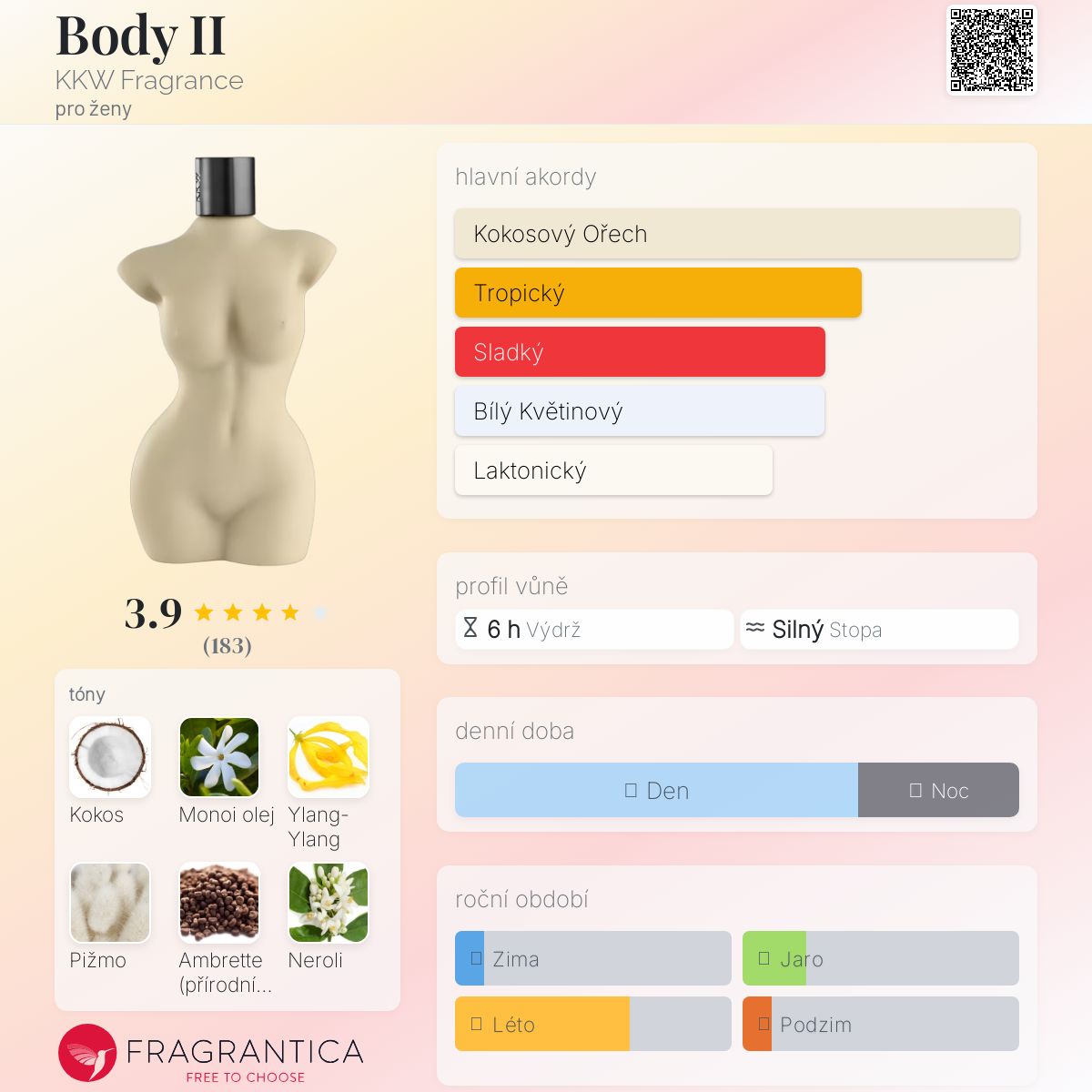 Body II podle KKW Fragrance je Floral Fruity Gourmand vůně pro ženy. Body II byl/a uveden/a v roce 2018. Vrchní tóny jsou Kokosový nektar, Neroli, Bergamot a Mandarinka; střední tóny jsouMonoi olej, Ylang-Ylang, Pomerančový květ a Jasmín ; základní tóny jsou Kokosové mléko, Pižmo a Ambrette (přírodní pižmo).