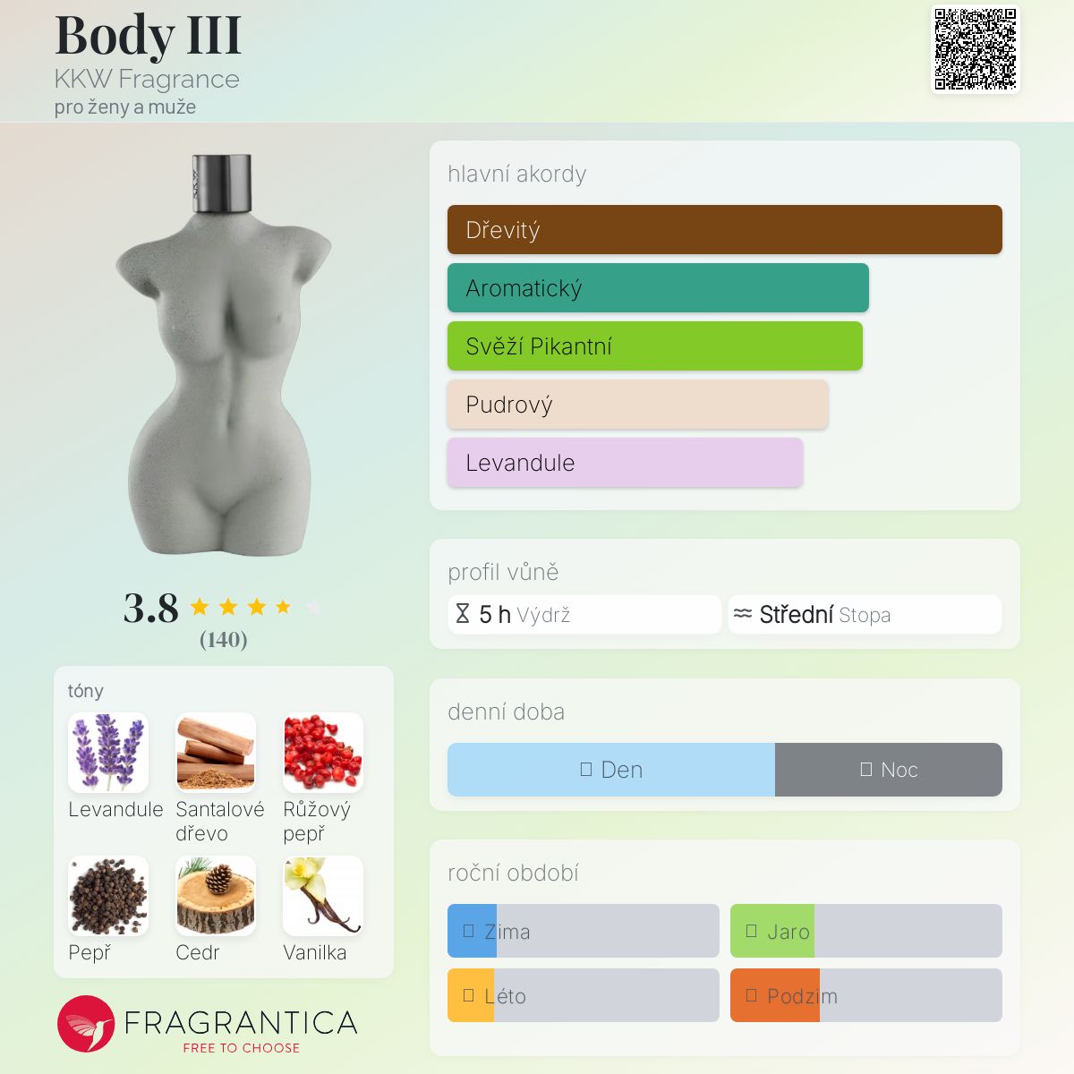 Body III podle KKW Fragrance je Woody Floral Musk vůně pro ženy a muže. Body III byl/a uveden/a v roce 2018. Vrchní tóny jsou Levandule, Růžový pepř, Černý pepř a Jalovcové bobulky; střední tóny jsouOrris, Fialkový list a Kadidlo ; základní tóny jsou Santalové dřevo, Cedr, Vanilka a Vetiver.