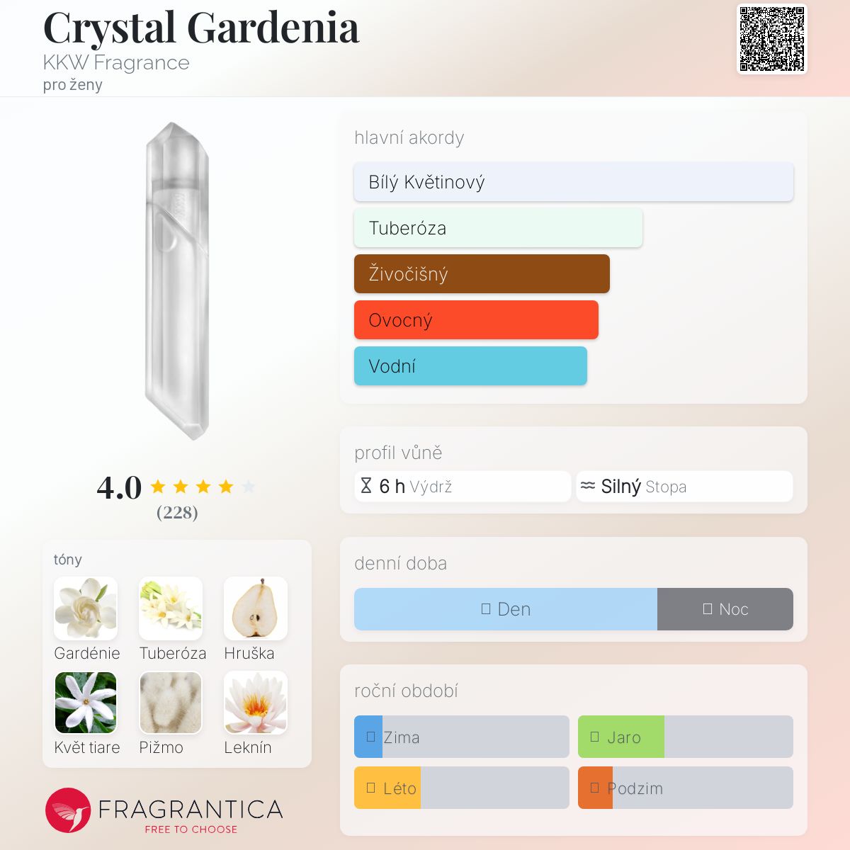 Crystal Gardenia podle KKW Fragrance je Floral Woody Musk vůně pro ženy. Crystal Gardenia byl/a uveden/a v roce 2017. "Nosem" za touto vůní je Nicole Mancini. Vrchní tóny jsou Hruška, Leknín a Růžový grapefruit; střední tóny jsouGardénie, Tuberóza a Květ tiare ; základní tóny jsou Pižmo, Santalové dřevo a Jantar (ambra).