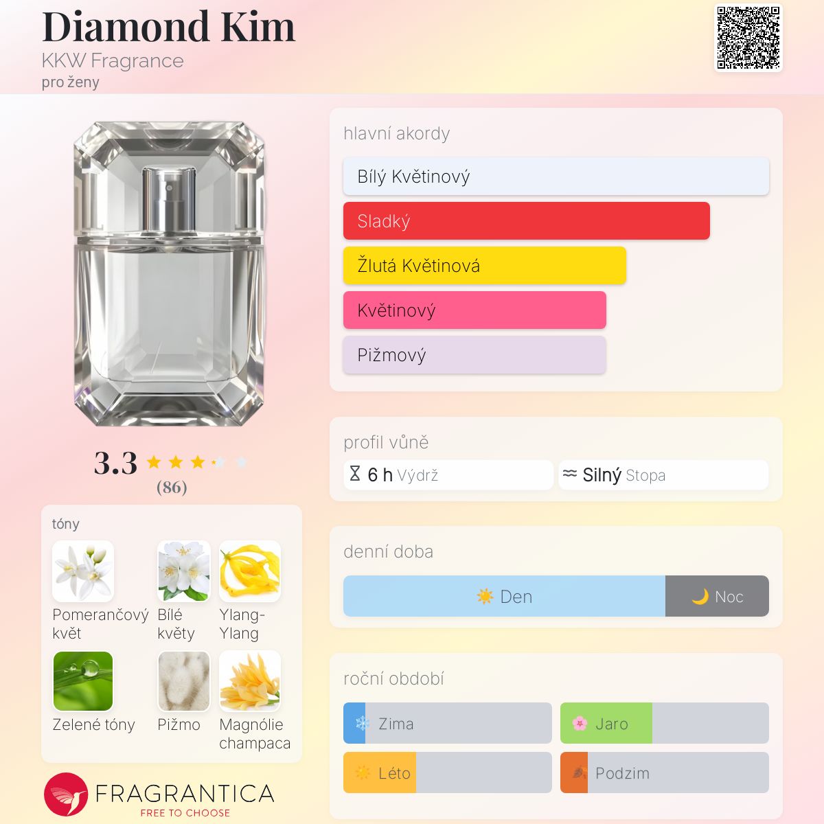 Diamond Kim podle KKW Fragrance je Floral vůně pro ženy. Diamond Kim byl/a uveden/a v roce 2019. Vrchní tóny jsou Zelené listí, Zázvor, Cukr a Pelyněk; střední tóny jsouPomerančový květ, Ylang-Ylang a Magnólie champaca ; základní tóny jsou Bílé květy, Bílé pižmo, Solární tóny a Kokosové mléko.