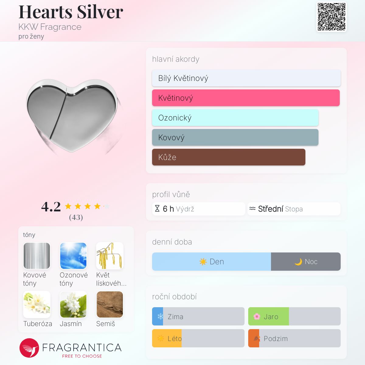 Hearts Silver podle KKW Fragrance je Floral vůně pro ženy. Hearts Silver byl/a uveden/a v roce 2021. Vrchní tóny jsou Kovové tóny, Ozonové tóny, Hruškový květ a Růžová voda; střední tóny jsouLískový květ, Tuberóza a Jasmín Sambac ; základní tóny jsou Semiš, Mech, Pižmo a Bříza.
