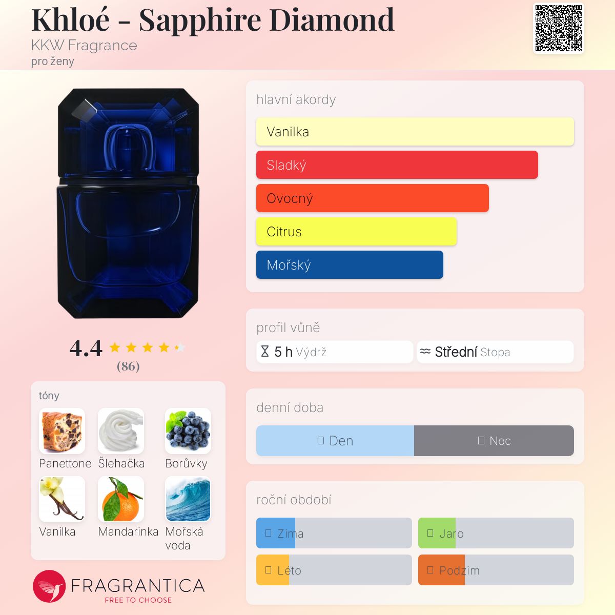 Khloé - Sapphire Diamond podle KKW Fragrance je Floral Fruity Gourmand vůně pro ženy. Khloé - Sapphire Diamond byl/a uveden/a v roce 2020. Vrchní tóny jsou Borůvky, Italská mandarinka a Mořské tóny; střední tóny jsouPanettone, Vistárie a Bulharská růže ; základní tóny jsou Šlehačka, Vanilka, Fazole tonka a Santalové dřevo.
