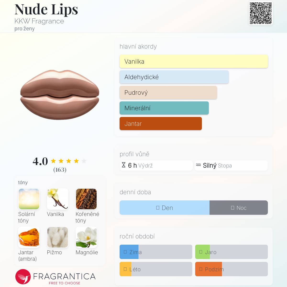 Nude Lips podle KKW Fragrance je Orientální Floral vůně pro ženy. Nude Lips byl/a uveden/a v roce 2019. "Nosem" za touto vůní je Givaudan. Vrchní tóny jsou Solární tóny, Koření a Konvalinka; střední tóny jsouMagnólie, Jasmín a Pivoňka ; základní tóny jsou Tahitská vanilka, Jantar (ambra) a Pižmo.