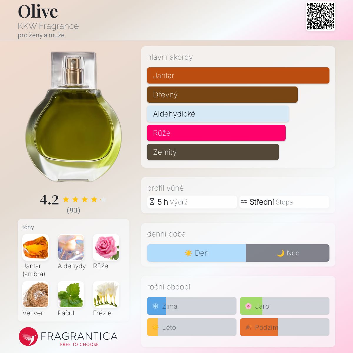 Olive podle KKW Fragrance je Chypre Floral vůně pro ženy a muže. Olive byl/a uveden/a v roce 2021. Vrchní tóny jsou Aldehydy, Růžová voda a Bergamot; střední tóny jsouRůže, Frézie a Jasmín ; základní tóny jsou Jantar (ambra), Vetiver a Pačuli.
