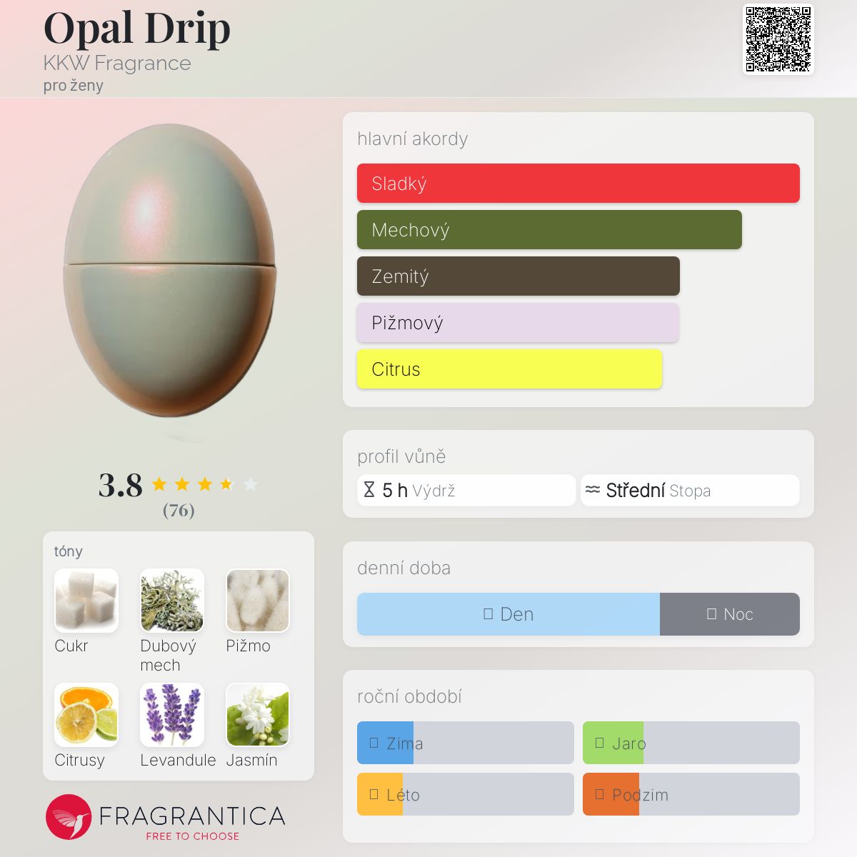 Opal Drip podle KKW Fragrance je Orientální Vanilla vůně pro ženy. Opal Drip byl/a uveden/a v roce 2021. Vrchní tóny jsou Citrusy, Levandule, Zelené tóny a Kapka rosy; střední tóny jsouJasmín, Aksamitník a Leknín ; základní tóny jsou Cukr, Dubový mech, Pižmo a Jantar (ambra).