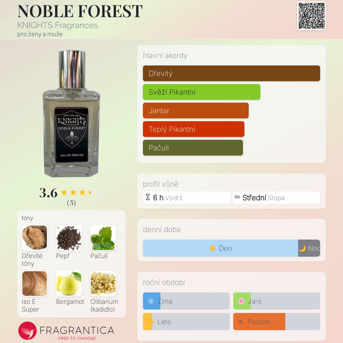 NOBLE FOREST podle KNIGHTS Fragrances je Woody vůně pro ženy a muže. NOBLE FOREST byl/a uveden/a v roce 2022. "Nosem" za touto vůní je Axel Rudi Pell. Vrchní tóny jsou Černý pepř a Bergamot; střední tóny jsouDřevité tóny, Pačuli, Olibanum, Agarové dřevo (oud) a Cypriolový olej ; základní tóny jsou Dřevité tóny a Iso E Super.