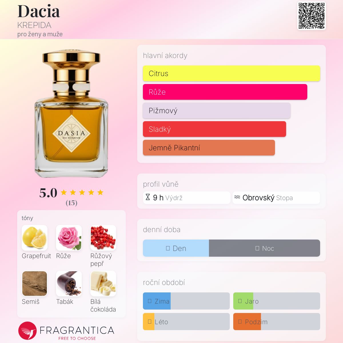 Dacia podle KREPIDA je Floral Fruity Gourmand vůně pro ženy a muže. Toto je nová vůně. Dacia byl/a uveden/a v roce 2025. "Nosem" za touto vůní je Diana Kordoff. Vrchní tóny jsou Růžový grapefruit, Růže a Broskev; střední tóny jsouRůžový pepř, Semiš, Tabák a Třešeň ; základní tóny jsou Bílá čokoláda, Kašmírové pižmo, Jantar (ambra) a Vanilka.