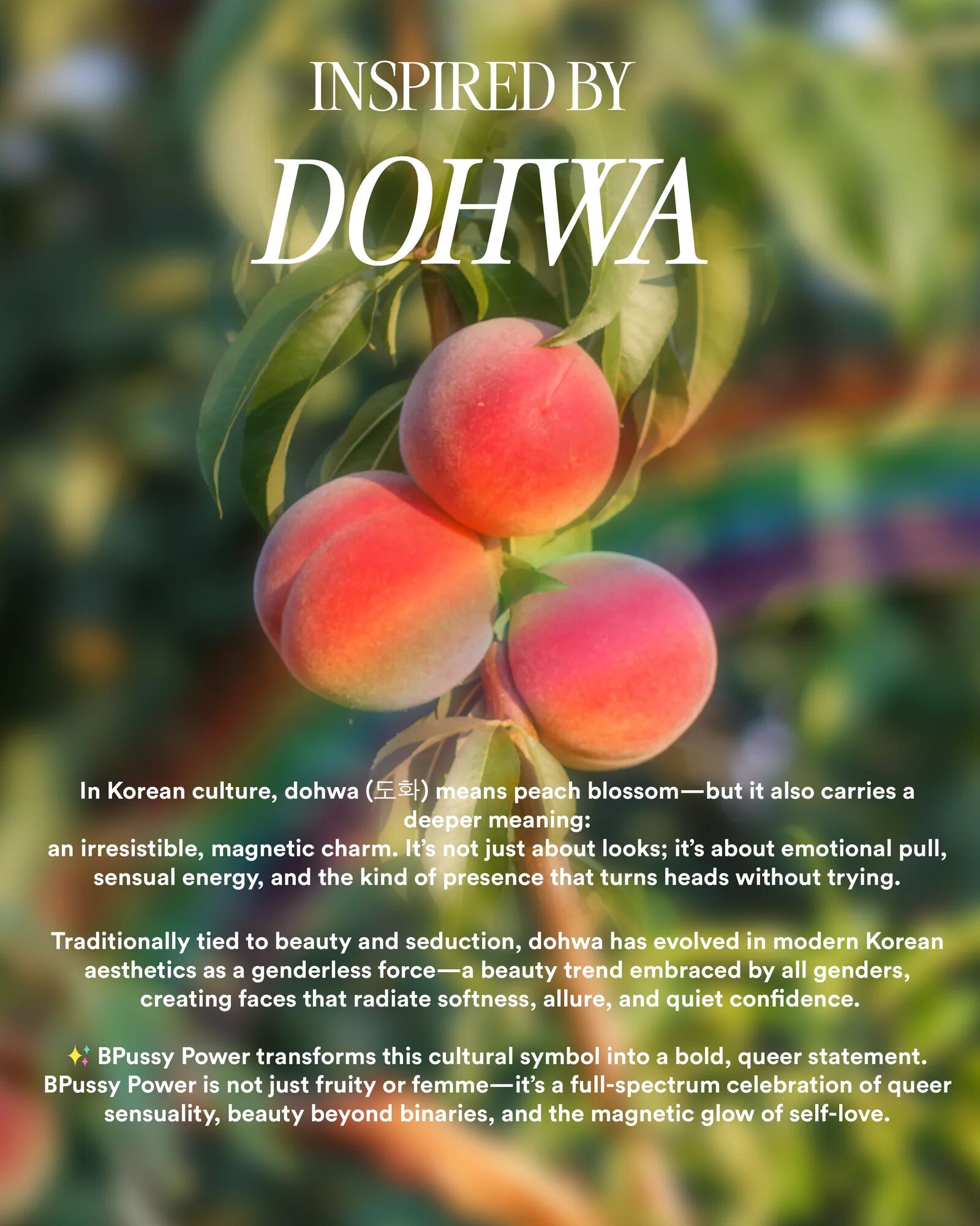 BPussy Power podle KST SCENT je Floral Fruity vůně pro ženy a muže. Toto je nová vůně. BPussy Power byl/a uveden/a v roce 2025. Vrchní tóny jsou Pupečník asijský a Yuzu; střední tóny jsouBroskvový květ, Hruška, Pižmo a Bílá broskev ; základní tóny jsou Zelená švestka, Dřevité tóny, Sirup, Jantar (ambra) a Kašmír.