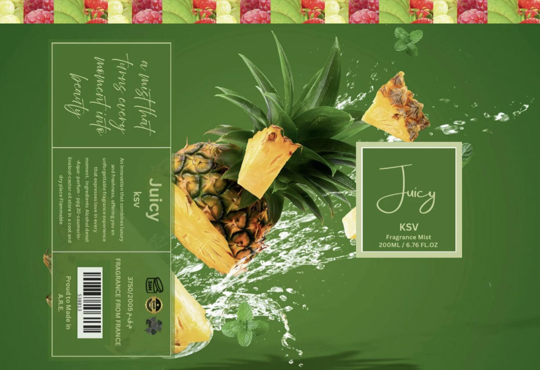 Juicy podle KSV je vůně pro ženy. Toto je nová vůně. Juicy byl/a uveden/a v roce 2025. "Nosem" za touto vůní je Mohamed Alshaarawy. Vrchní tóny jsou Červené jablko, Liči, Černý rybíz a Růžový grapefruit; střední tóny jsouLesní plody, Květ malinovníku, Jasmín a Květná růže ; základní tóny jsou Cukr, Pižmo, Vanilkový květ, Jantar (ambra) a Dubový mech.