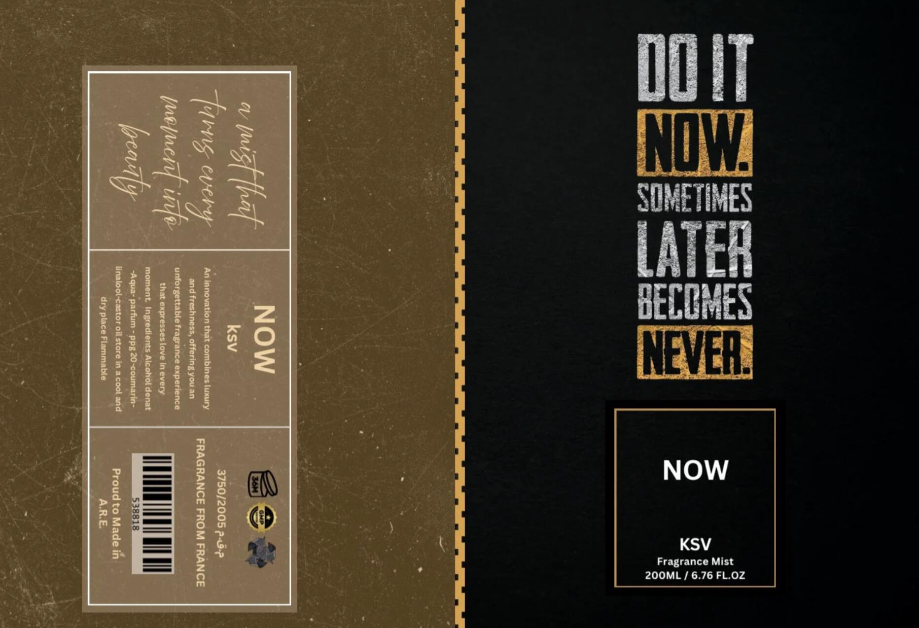Now podle KSV je vůně pro ženy a muže. Toto je nová vůně. Now byl/a uveden/a v roce 2025. "Nosem" za touto vůní je Mohamed Alshaarawy. Vrchní tóny jsou Broskev, Hruška, Mučenka, Ananas, Švestka a Bergamot; střední tóny jsouKašmírové dřevo, Jasmín, Frézie a Fialkový list ; základní tóny jsou Pižmo, Kambodžský oud, Vanilka a Křišťálový jantar.