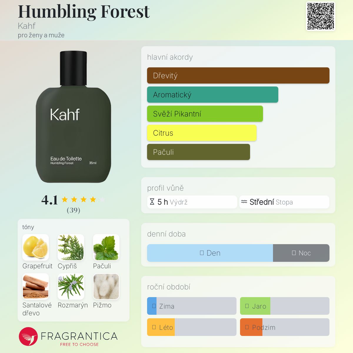 Humbling Forest podle Kahf je Woody Aromatic vůně pro ženy a muže. Vrchní tóny jsou Grapefruit, Cypřiš a Rozmarýn; střední tóny jsouCedr, Jasmín a Guajakové dřevo ; základní tóny jsou Pačuli, Santalové dřevo a Pižmo.