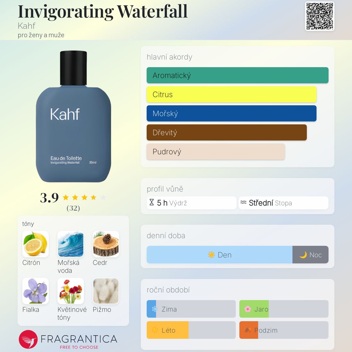 Invigorating Waterfall podle Kahf je Aromatic Aquatic vůně pro ženy a muže. Vrchní tóny jsou Citrón a Mořské tóny; střední tóny jsouCedr, Fialka a Květinové tóny ; základní tóny jsou Pižmo, Pačuli, Vetiver a Jantar (ambra).