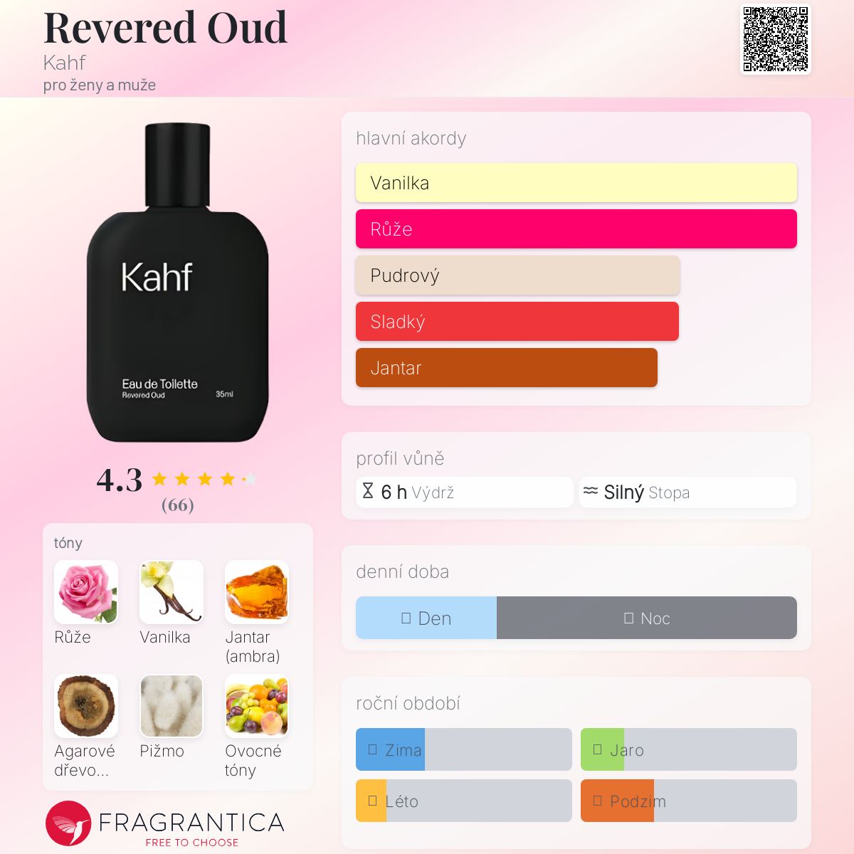 Revered Oud podle Kahf je Orientální vůně pro ženy a muže. Vrchní tóny jsou Růže, Ovocné tóny a Citrón; střední tóny jsouJantar (ambra) a Gurmánský tón ; základní tóny jsou Vanilka, Agarové dřevo (oud) a Pižmo.