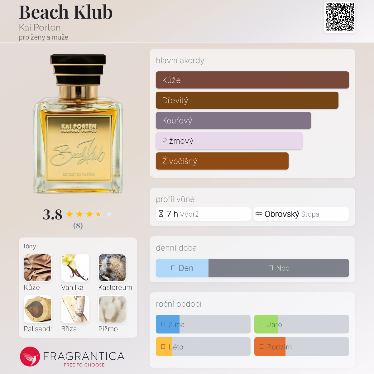 Beach Klub podle Kai Porten je Leather vůně pro ženy a muže. Toto je nová vůně. Beach Klub byl/a uveden/a v roce 2025. "Nosem" za touto vůní je Miguel Matos. Vrchní tóny jsou Palisandr, Březový list a Jablko; střední tóny jsouKůže, Cade olej a Oregano ; základní tóny jsou Vanilka, Kastoreum, Pižmo, Guajakové dřevo a Cibetka.
