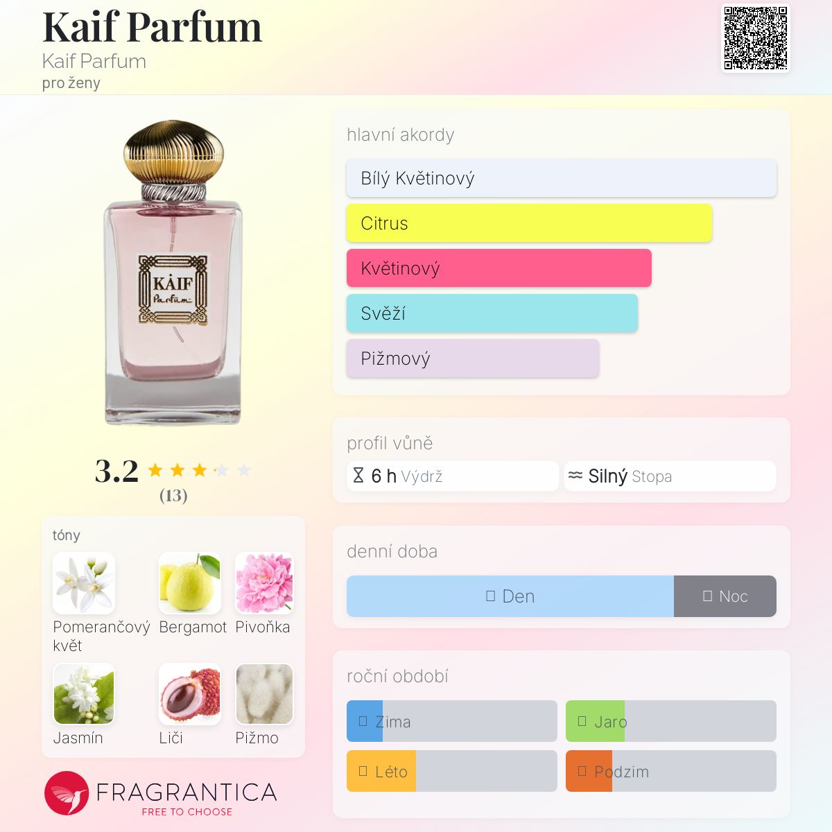 Kaif Parfum podle Kaif Parfum je vůně pro ženy. Kaif Parfum byl/a uveden/a v roce 2018. Vrchní tóny jsou Bergamot a Liči; střední tóny jsouPomerančový květ, Pivoňka a Jasmín ; základní tóny jsou Pižmo a Dubový mech.