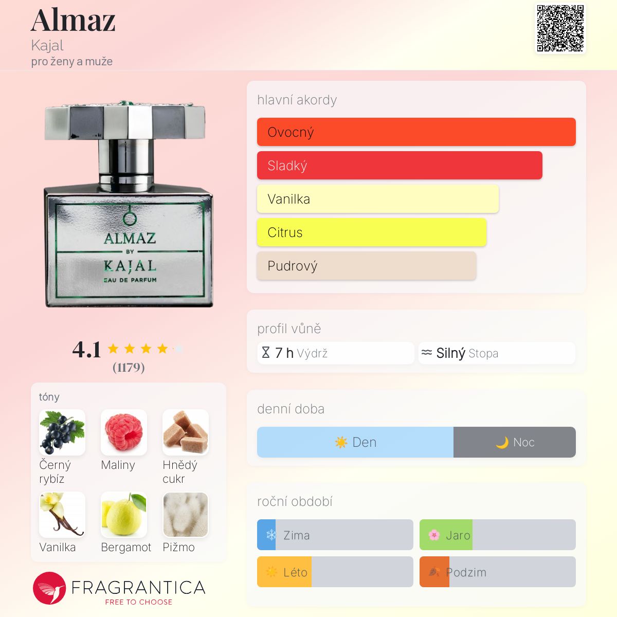 Almaz podle Kajal je vůně pro ženy a muže. Almaz byl/a uveden/a v roce 2022. "Nosem" za touto vůní je Rania Jouaneh. Vrchní tóny jsou Černý rybíz, Kalábrijský bergamot, Citron amalfi a Mandarinka; střední tóny jsouMaliny, Otočník, Turecká růže a Orris ; základní tóny jsou Hnědý cukr, Madagaskarská vanilka, Pižmo, Fazole tonka, Santalové dřevo a Jantar (ambra).