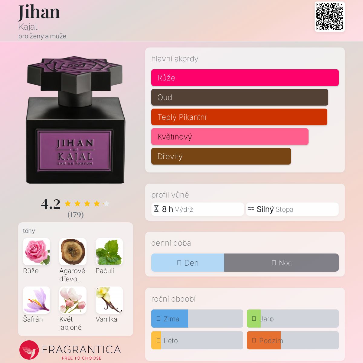 Jihan podle Kajal je Woody Spicy vůně pro ženy a muže. Jihan byl/a uveden/a v roce 2018. Vrchní tóny jsou Šafrán a Květ jabloně; střední tóny jsouRůže, Hřebíček a Magnólie ; základní tóny jsou Agarové dřevo (oud), Pačuli, Vanilka, Santalové dřevo a Pižmo.