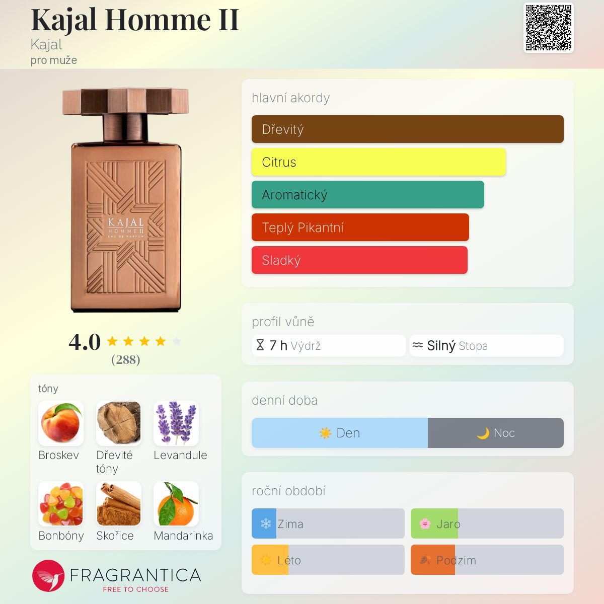 Kajal Homme II podle Kajal je Woody Aromatic vůně pro muže. Kajal Homme II byl/a uveden/a v roce 2021. Kajal Homme II byl/a vytvořen/a Rosendo Mateu a Christian Carbonnel. Vrchní tóny jsou Mandarinka, Bergamot, Jantar (ambra), Citrón, Zelené tóny a Pomerančový květ; střední tóny jsouBroskev, Levandule, Skořice, Cedr, Rozmarýn, Šalvěj muškátová a Hřebíček ; základní tóny jsou Dřevité tóny, Sladké tóny, Santalové dřevo, Dubový mech, Pačuli a Pižmo.