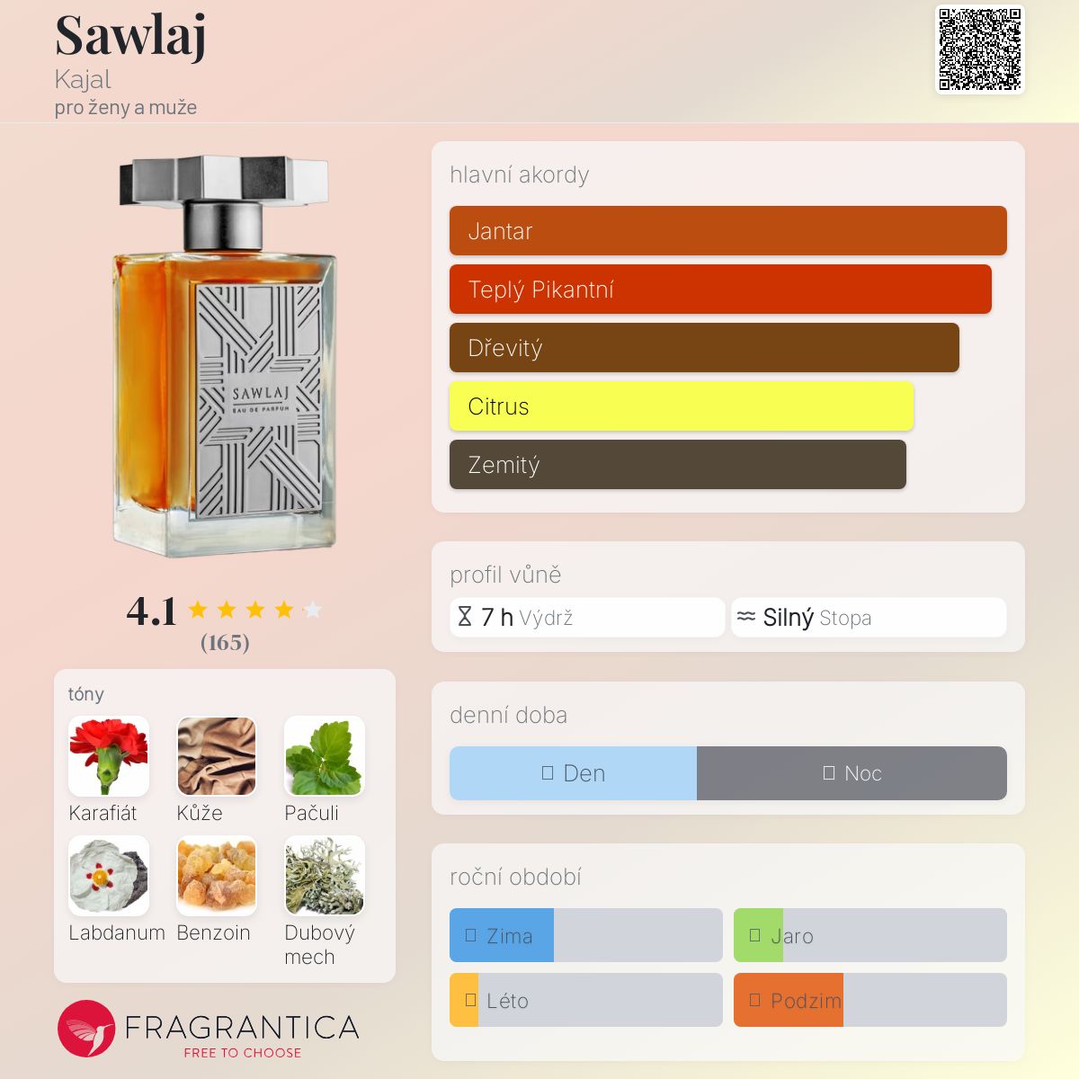Sawlaj podle Kajal je Leather vůně pro ženy a muže. Sawlaj byl/a uveden/a v roce 2017. "Nosem" za touto vůní je Christian Carbonnel. Vrchní tóny jsou Labdanum, Citrón a Bergamot; střední tóny jsouKarafiát, Kůže, Pačuli, Jasmín a Růže ; základní tóny jsou Benzoin, Dubový mech, Vanilka a Vetiver.